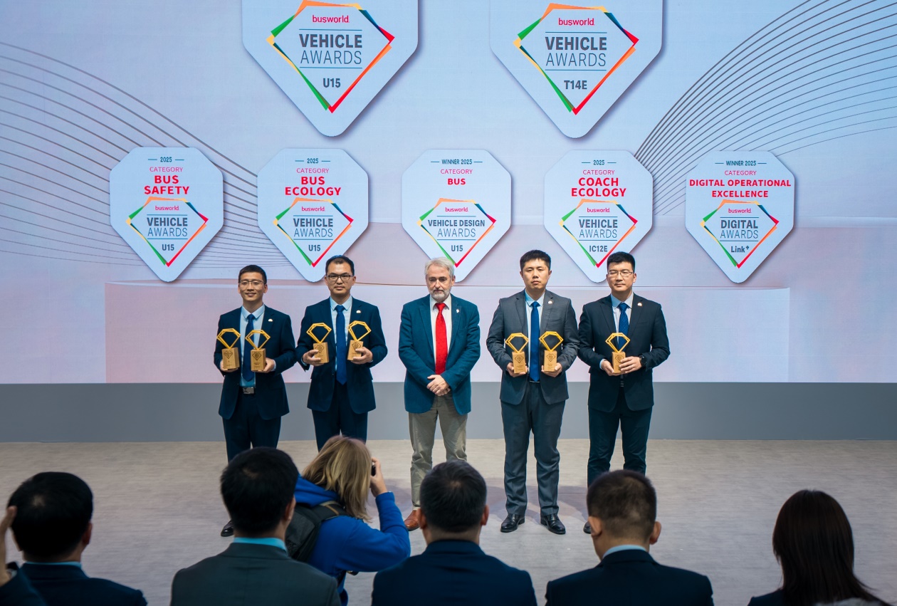 在这场盛会上,中国客车品牌宇通以“Think Eco,Move Green”为主题,携高端纯电动车型及多项前沿技术亮相,并一举斩获“年度最佳客车大奖”“年度最佳巴士大奖”等七项Busworld大奖,创下迄今中国客车品牌参评Busworld获奖数量的最高纪录。其中,年度最佳客车大奖和年度最佳巴士大奖,均为中国客车品牌在Busworld首次获得,再次为中国制造赢得荣光。