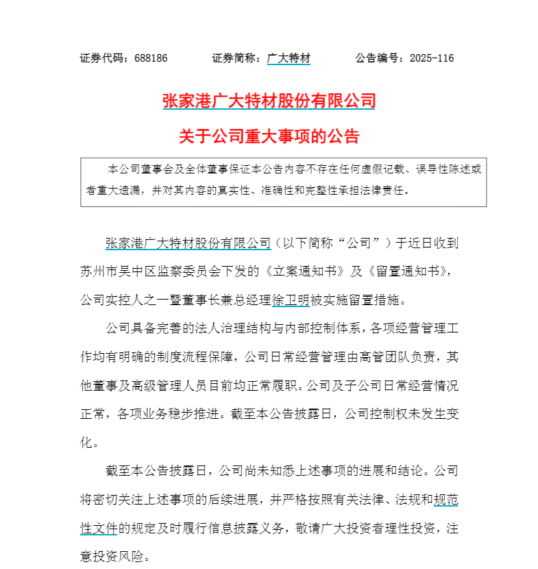 14日盘后,广大特材(688186)发布公告称,公司于近日收到苏州市吴中区监察委员会下发的《立案通知书》及《留置通知书》,公司实控人之一暨董事长兼总经理徐卫明被实施留置措施。