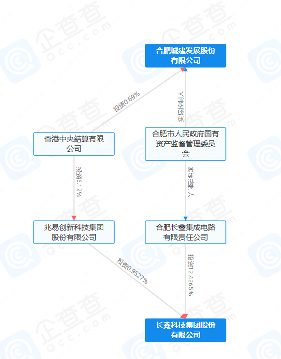 经企查查数据股权穿透可见,合肥城建和长鑫集成的实控人均为合肥市国资委,而长鑫集成对外投资了长鑫科技,其对后者的持股比例为12.4265%,间接持股比例为11.893%。