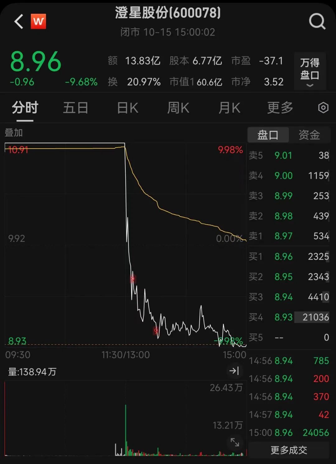 15日早盘,澄星股份开盘即涨停,就在投资者以为公司股价即将拿下“五连板”时,该股股价午后突然直线跳水,盘中一度触及跌停价,上演“天地板”走势。截至收盘,该股股价报8.96元/股,成交额达13.83亿元,创2011年10月以来的新高。