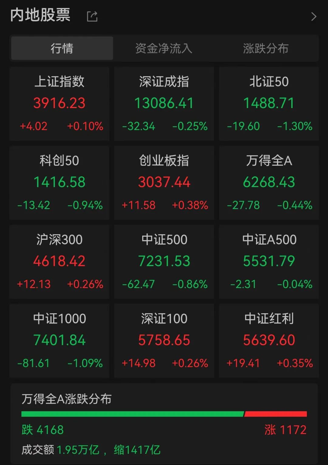 16日,A股三大指数表现分化,全市场个股涨跌中位数为-1.26%。沪深两市成交额回落至2万亿元以下,较昨日缩量1417亿元。