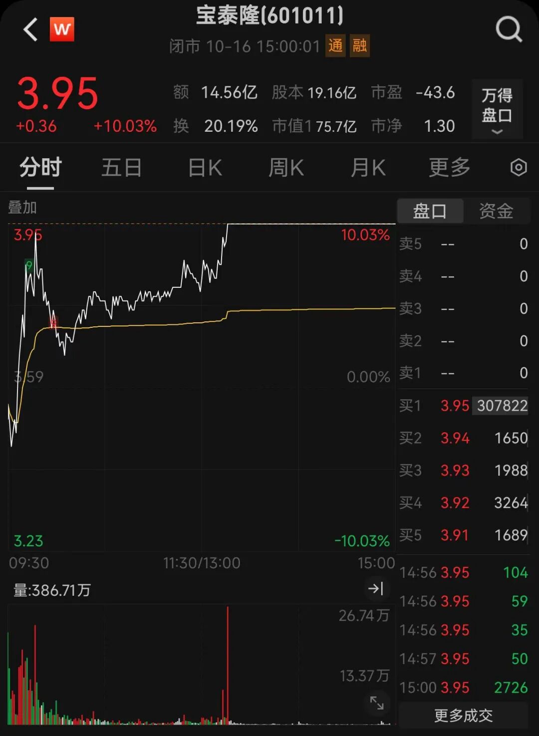 受益于煤炭板块的强势上攻,昨日收出巨量长阴的宝泰隆(601011)今日小幅低开后快速翻红,并于午后强势封板,走出5天4板,5个交易日累计上涨33%。
