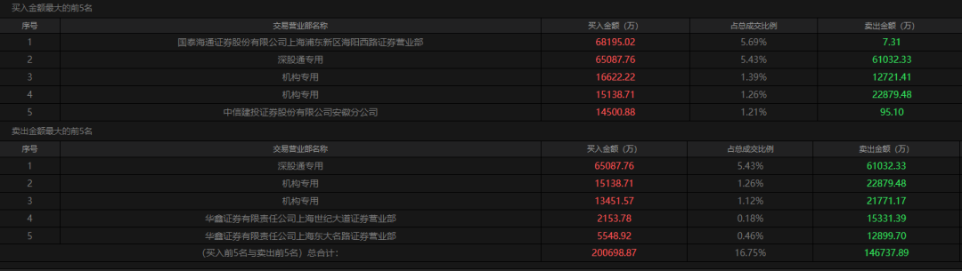 这场风波似乎也波及到了顶级游资“章盟主”。从昨日的龙虎榜数据来看,“章盟主”所在国泰海通上海浦东新区海阳西路营业部席位以6.82亿元的买入金额,位居买一位置;深股通“左右互搏”买入6.51亿元并卖出6.1亿元;机构席位净卖出。
