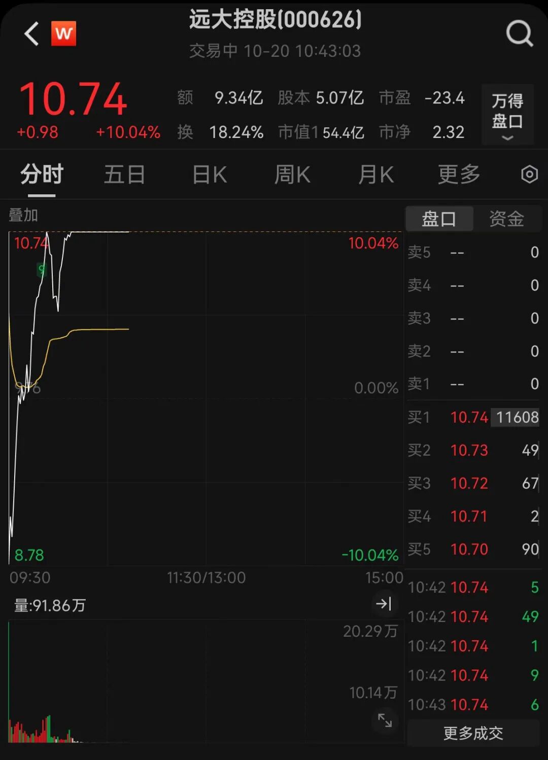 20日早盘,已连续4个交易日涨停的远大控股(000626)盘初上演“30秒惊魂”。