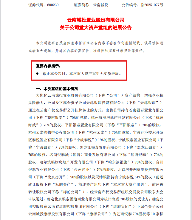 除上述消息外,近日,云南城投对外披露了重大资产重组的进展情况。为优化资产结构、增强抗风险能力,云南城投及子公司天津银润投资有限公司通过云南产权交易所挂牌转让方式,出售持有包括苍南银泰置业有限公司在内的11家标的公司股权。公告中,云南城投提示,截至本公告日,本次重大资产重组无实质进展。
