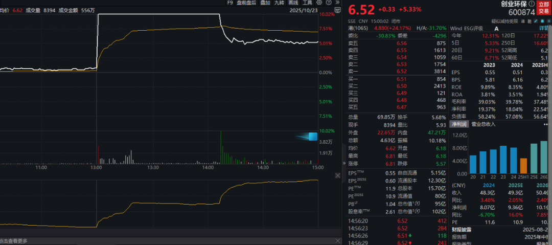 23日午后刚开盘,A股环保板块部分个股出现罕见异动,创业环保(600874)率先“起飞”。一笔17093手的买单突然涌入该股,推动其股价在短短5秒钟即直线冲上涨停,但涨停态势仅维持约一小时便被打破,最终收涨5.33%,日线走出一根长上影巨阳。