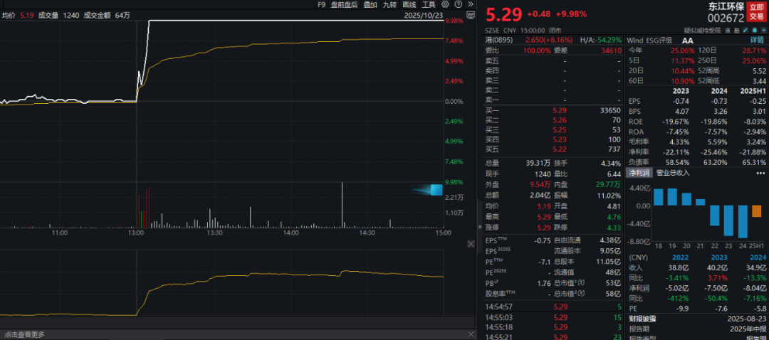 与创业环保同属环保板块的东江环保也紧随其后,在午后开盘4分钟内就封死涨停,直至收盘仍未打开,报收于5.29元/股,成交额超2亿元。