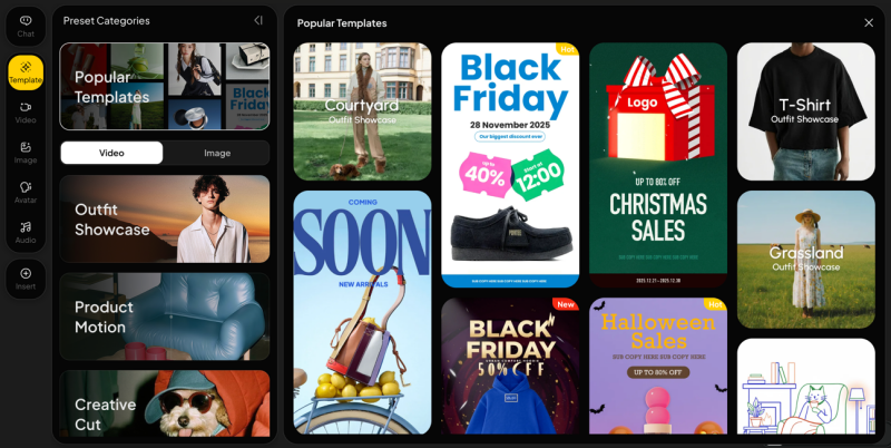 SkyReels堪称是AI驱动的视觉内容引擎:无论是智能海报、商品B-Roll视频,还是音画同出的广告大片,在产品内的模板中均可一键生成。我们更提供SOTA级的虚拟试穿与可用于商品演示的逼真数字人,全面革新您的视觉内容生产。在模板功能中,我们提供横跨图片与视频两大模态的AI内容解决方案,专为提升产品的营销转化率与品牌表现力而设计: