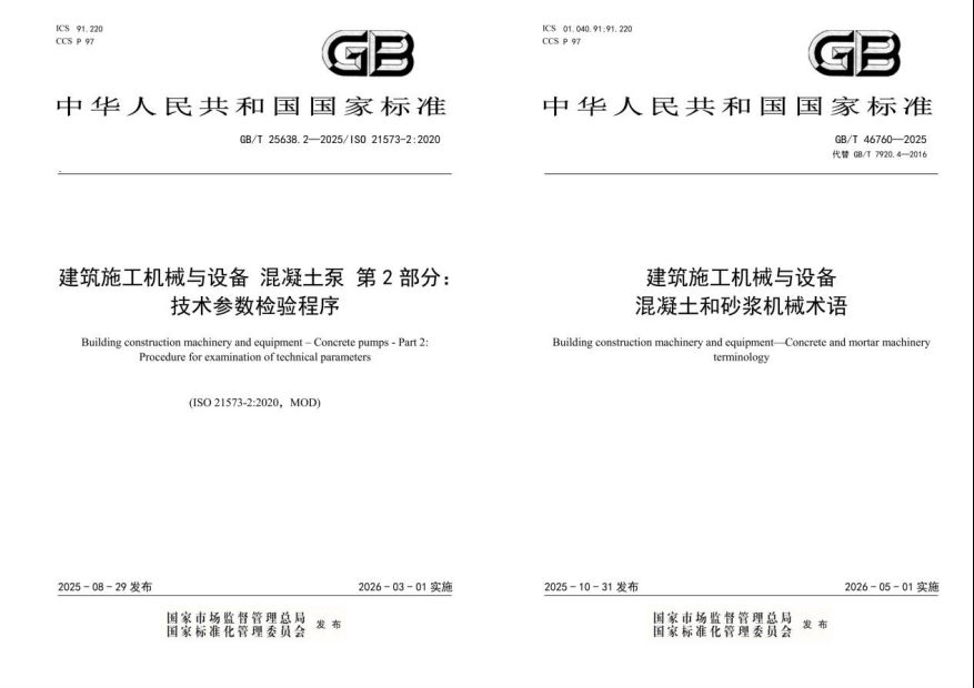 据了解,中联重科此次牵头编制的两项国家标准分别是GB/T 25638.2-2025《建筑施工机械与设备 混凝土泵 第2部分:技术参数的检验程序》和GB/T 46760-2025《建筑施工机械与设备 混凝土和砂浆机械术语》。