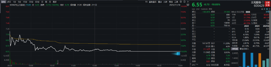 因奶皮子糖葫芦的火爆而斩获四连板的三元股份(600429),今日盘中持续低位震荡,午后被按死跌停,最终报收于6.55元/股,卖一位置积压近8万手卖单等待出逃。