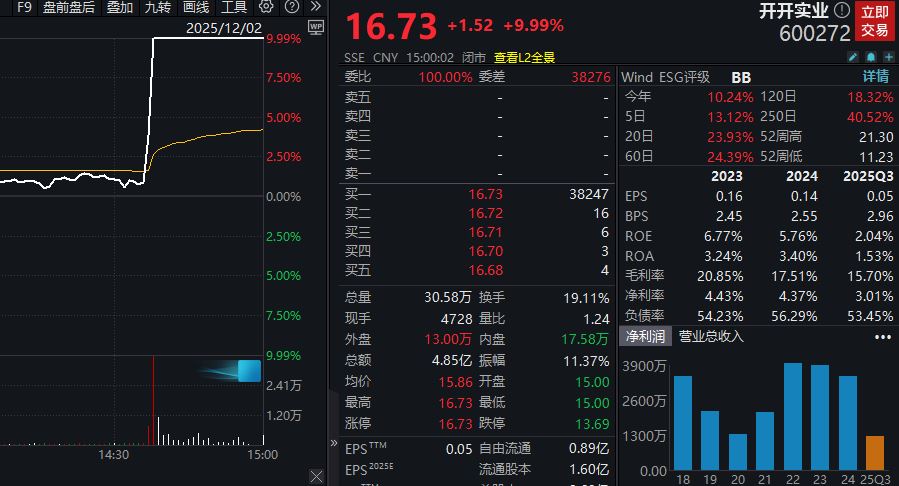 今日尾盘,开开实业(600272)股价突然异动拉升,仅用不到3分钟时间就冲上涨停板,最终收报16.73元/股。