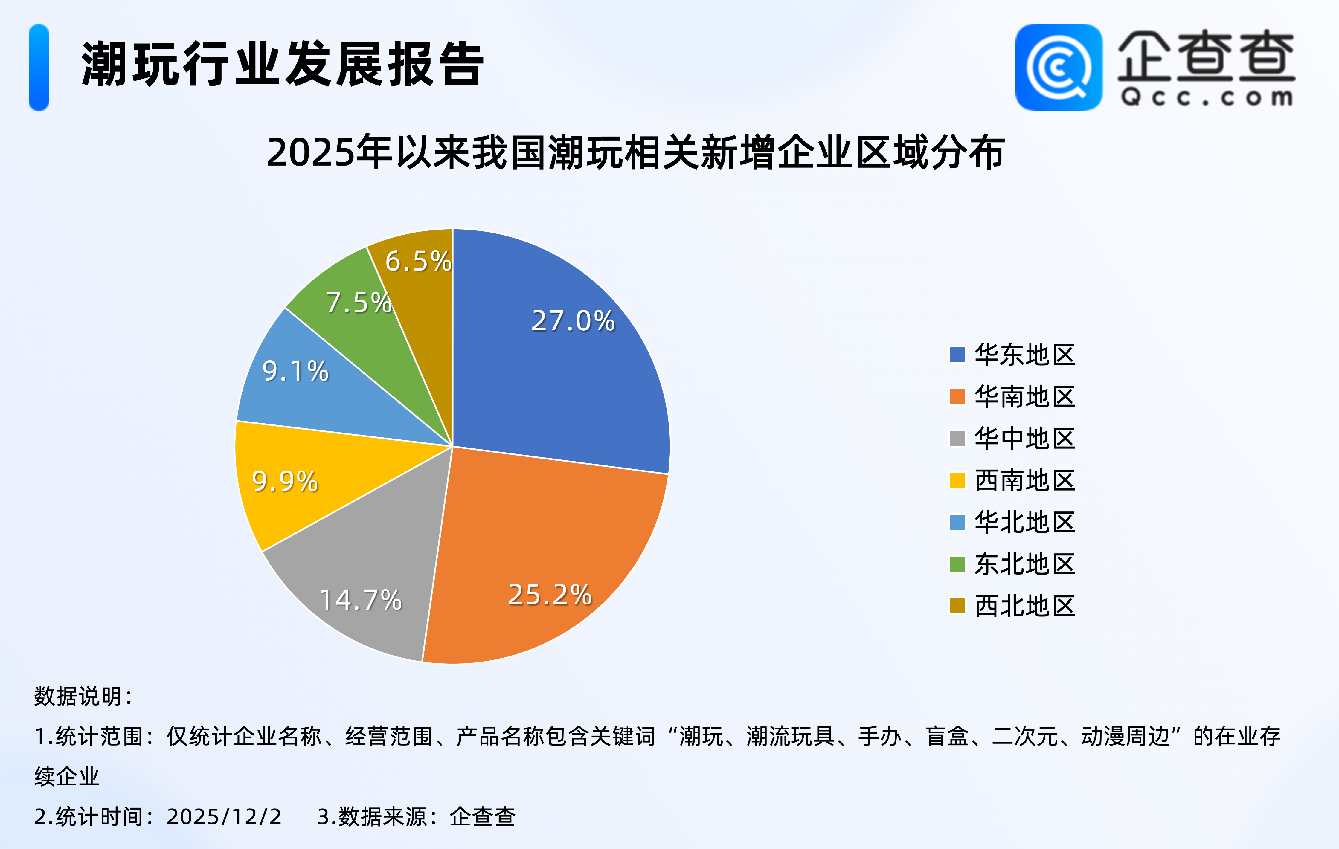 企查查数据显示,从2025年以来新注册的潮玩相关企业区域分布来看,与企业存量区域分布不同的是,截至目前,今年华东地区新注册的潮玩相关企业最多,占全国总注册量的27.0%,超过华南地区,华南地区占比25.2%。