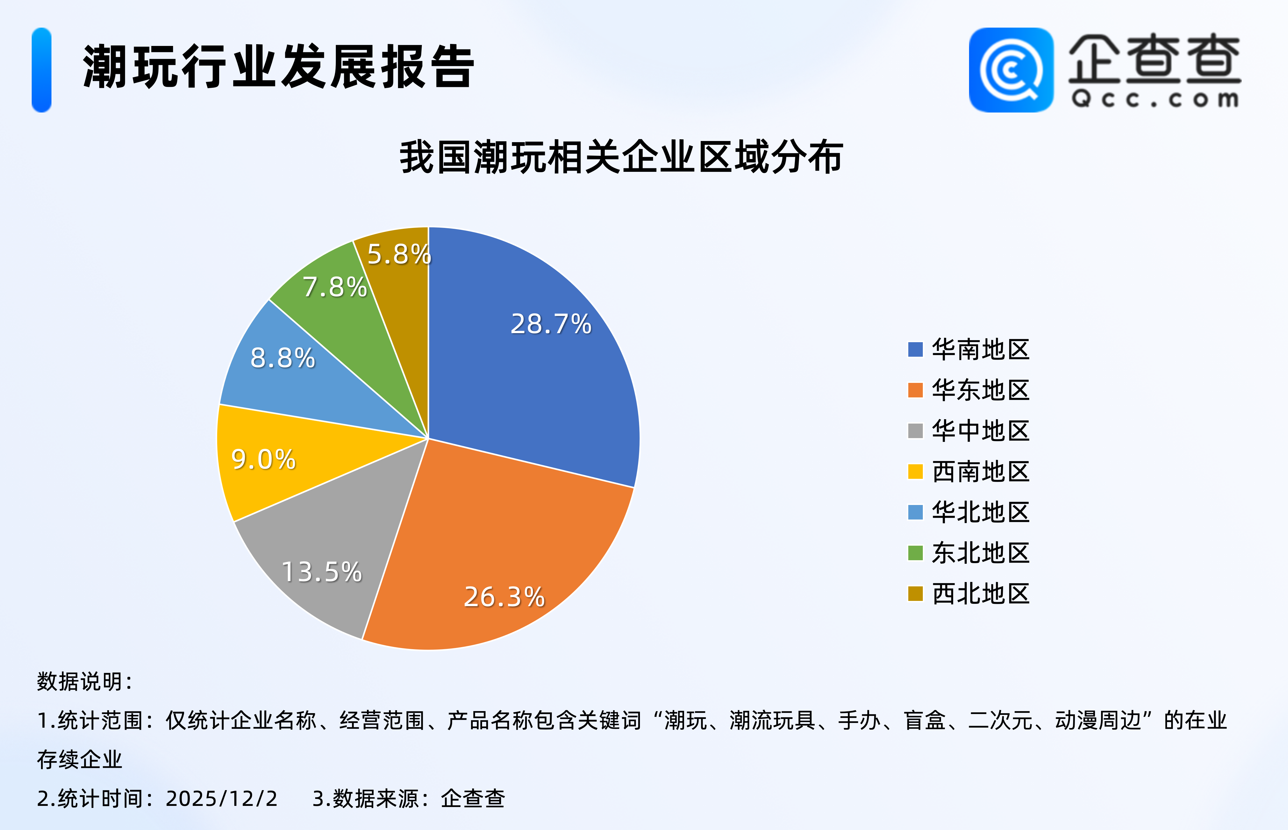 企查查数据显示,截至12月2日,我国现存2.5万家潮玩相关企业,区域分布上,分布在华南地区的相关企业最多,占比28.7%,其次是华东地区,占比26.3%,分布在东北、西北地区的相关企业数量相对较少,分别占比7.8%、5.8%。