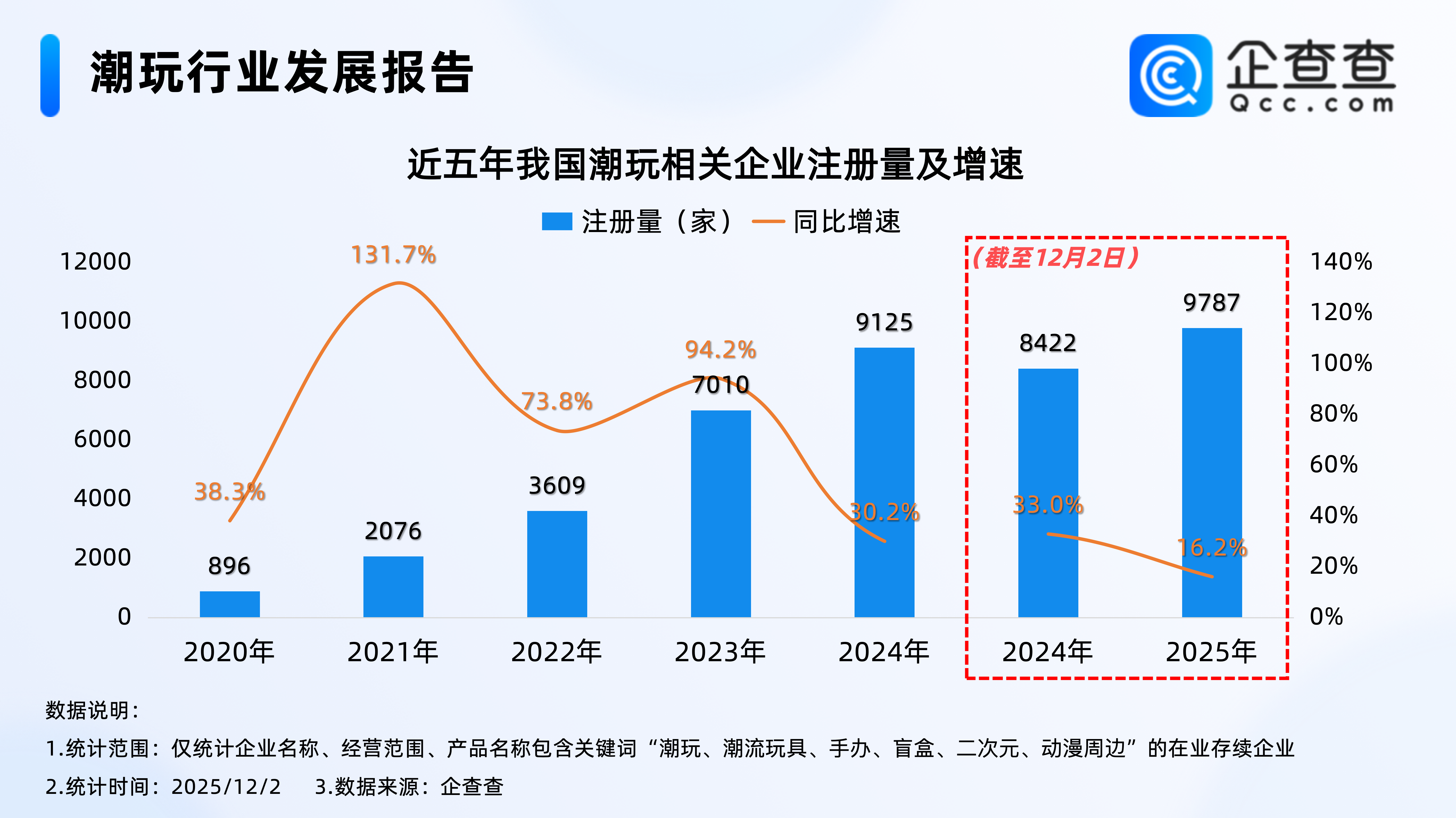 企查查数据显示,2020年以来,我国潮玩相关企业每年注册量逐年增加,2024年全年注册9125家潮玩相关企业,达近五年注册量峰值;截至12月2日,2025年我国已注册9787家潮玩相关企业,已超2024年全年,相比2024年同期增加16.2%。