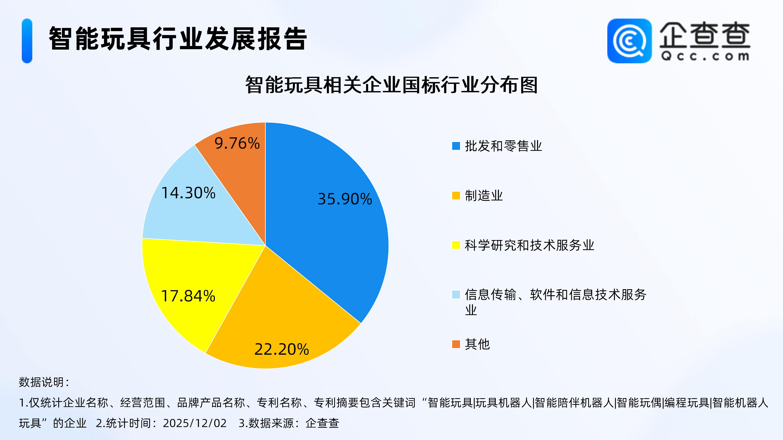 企查查数据显示,从国标行业来看,智能玩具相关企业多归属于批发和零售业、制造业、科学研究和技术服务业以及信息传输、软件和信息技术服务业,分别占比35.90%、22.20%、17.84%、14.30%。注册量方面,2024年全年注册24家智能玩具相关企业,截至目前,今年已注册23家。