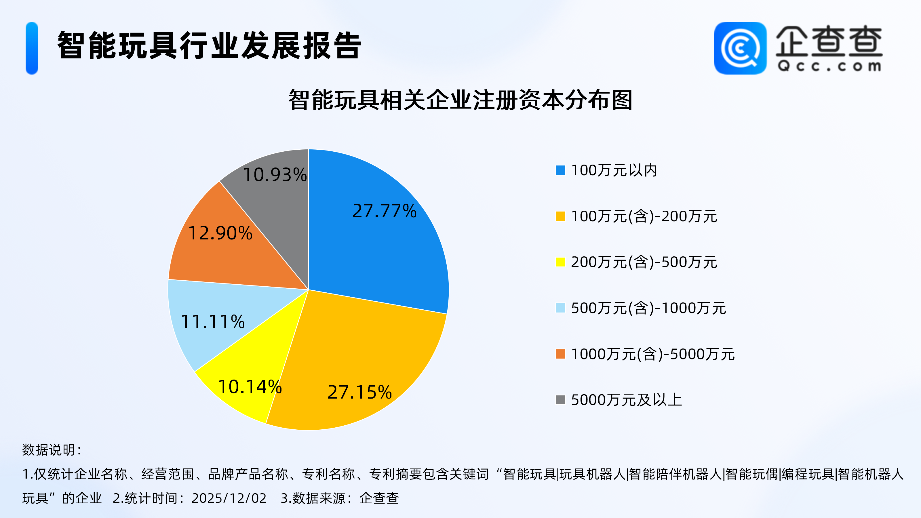 企查查数据显示,从注册资本来看,智能玩具相关企业分布较为均匀,注册资本在100万元以内的相关企业占比27.77%。其次,注册资本在100万元(含)-200万元的相关企业占比27.15%。在1000万元(含)-5000万元、5000万元及以上层级的相关企业分别占比12.90%、10.93%。
