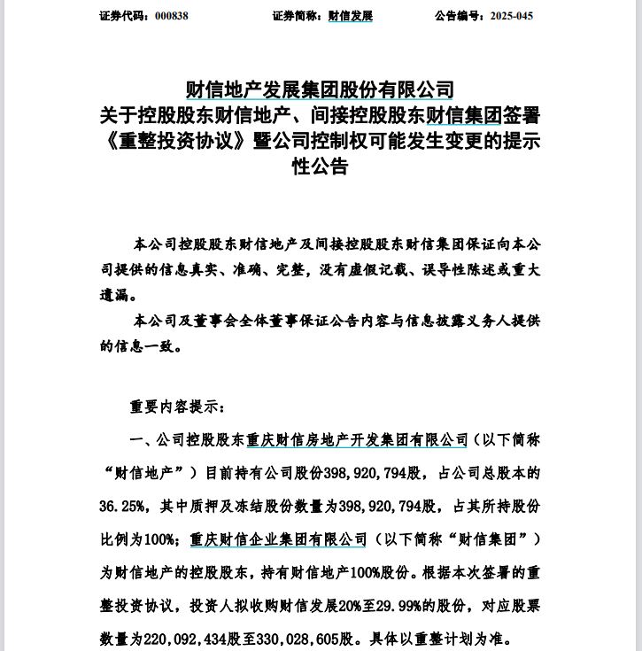 相关公告显示,财信发展控股股东财信地产及间接控股股东财信集团与投资人江西中久天然气集团有限公司(下称“江西中久”)签署《重整投资协议》。江西中久拟收购公司20%至29.99%的股份。投资完成后,江西中久将成为财信发展的控股股东,雍芝君将成为公司的实际控制人。