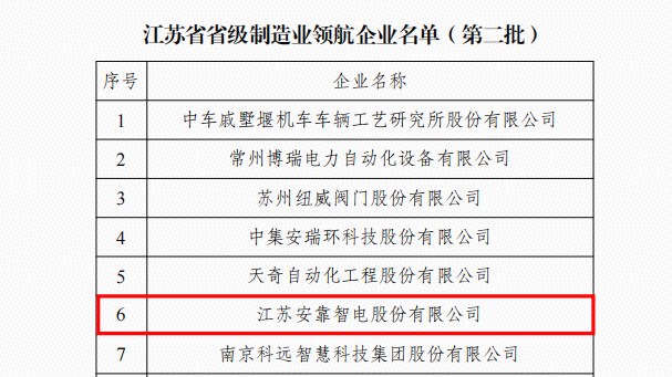 近日,江苏省工业和信息化厅公布省级制造业领航企业名单,安靠智电凭借智能输电领域的技术创新实力、行业带动效应及发展质量成功入选。