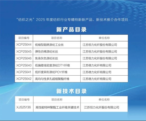近日,中国纺织工业联合会发布《“纺织之光”2025年度纺织行业专精特新新产品、新技术推介合作项目汇编》,恒力石化(600346.SH)旗下江苏恒力化纤、江苏德力化纤共7项成果入选,彰显其在纺织化纤领域的技术优势与行业地位。