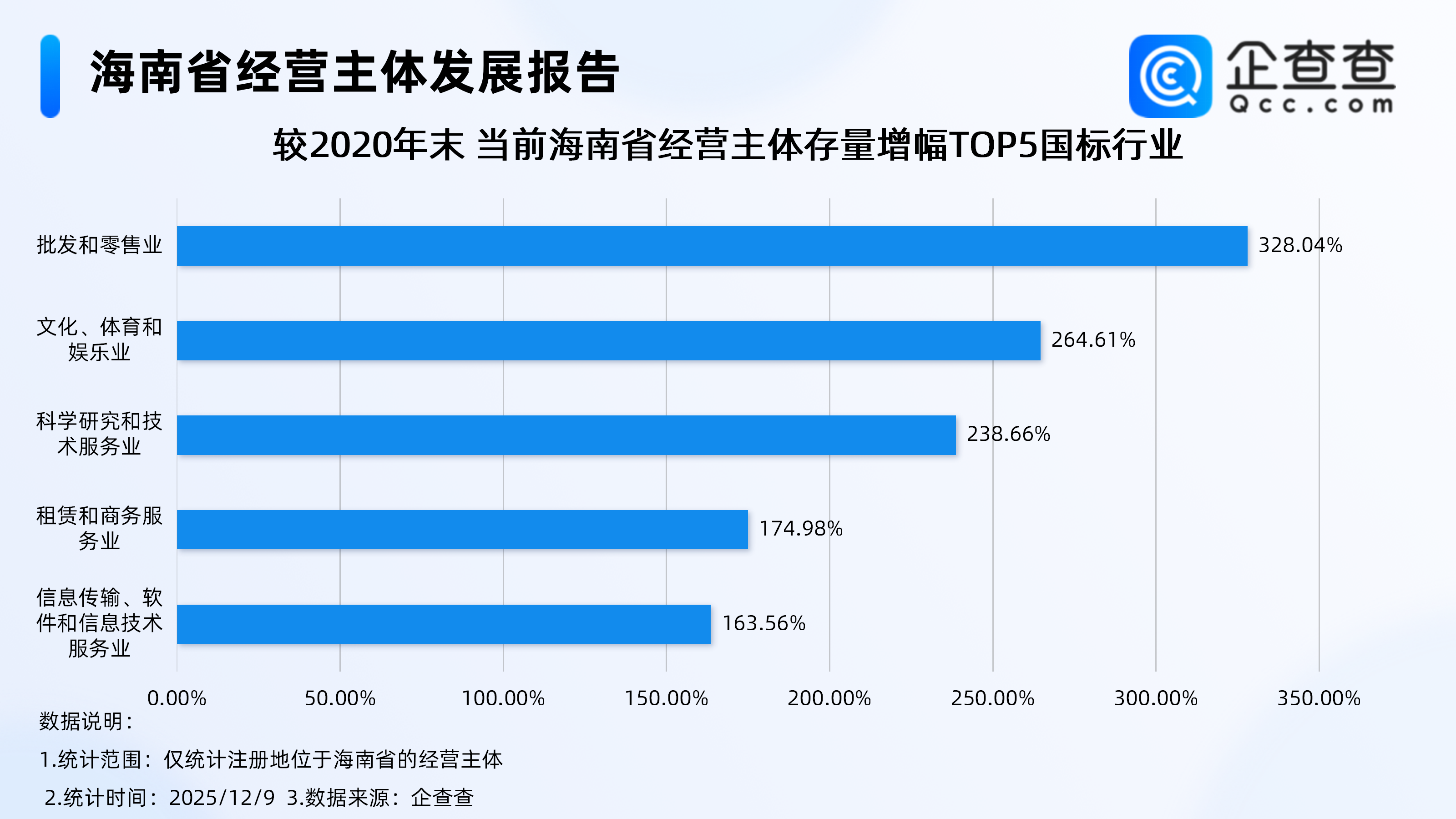 企查查数据显示,较5年前(即2020年末),当前海南经营主体存量中,增幅最大为批发和零售业,文化、体育和娱乐业,科学研究和技术服务业这三个行业,经营主体存量增幅分别达328.04%、264.61%、238.66%。值得关注的是,较5年前,当前海南省企业存量增幅前五国标行业与经营主体存量增幅前五国标行业,有较大不同。