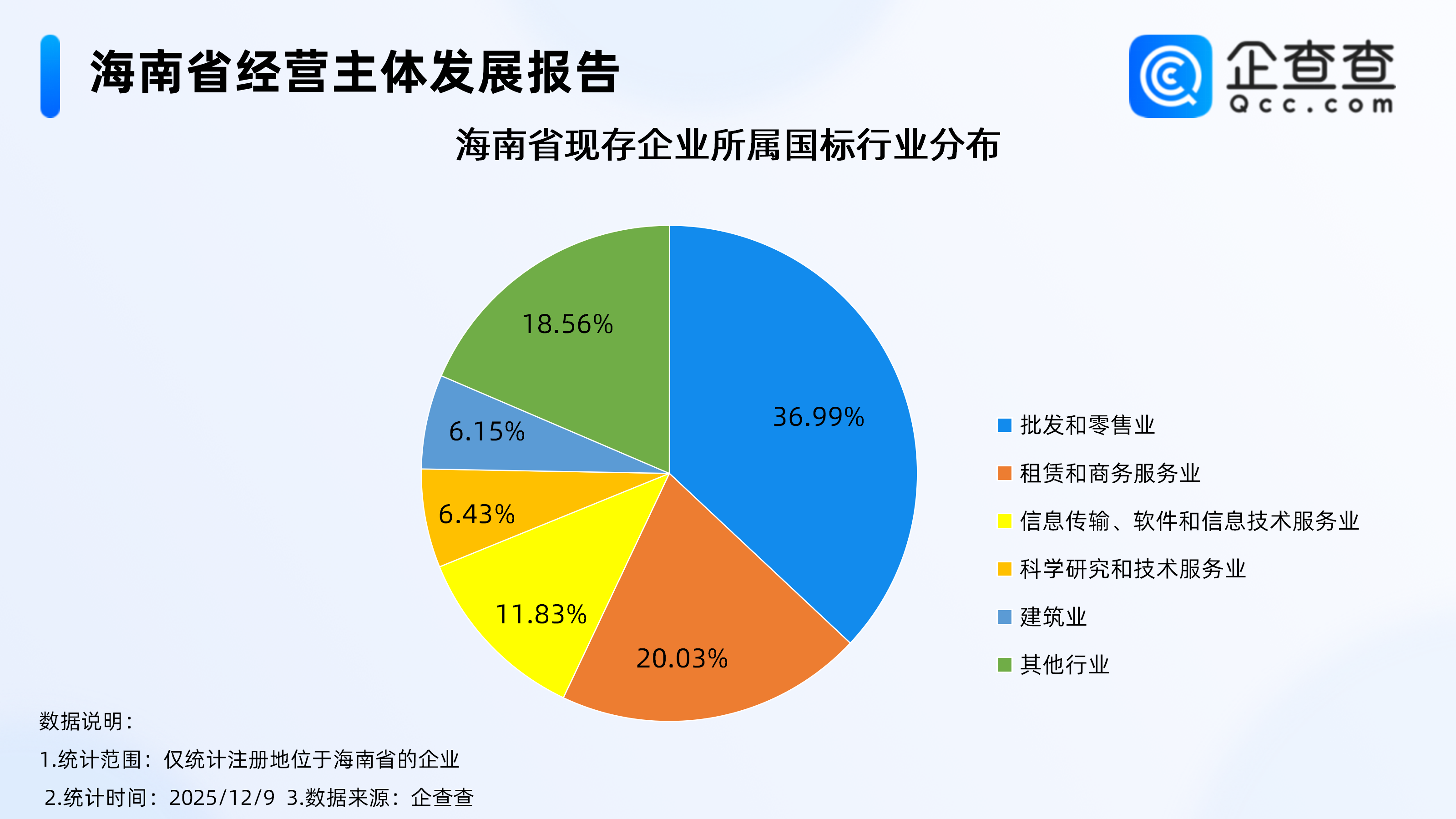 企查查数据显示,进一步细看海南省现存企业的国标行业分布,归属于批发和零售业的企业最多,占比达36.99%,此外,租赁和商务服务业,信息传输、软件和信息技术服务业,科学研究和技术服务业的这三个行业的企业存量较多,占比分别达20.03%、11.83%、6.43%。