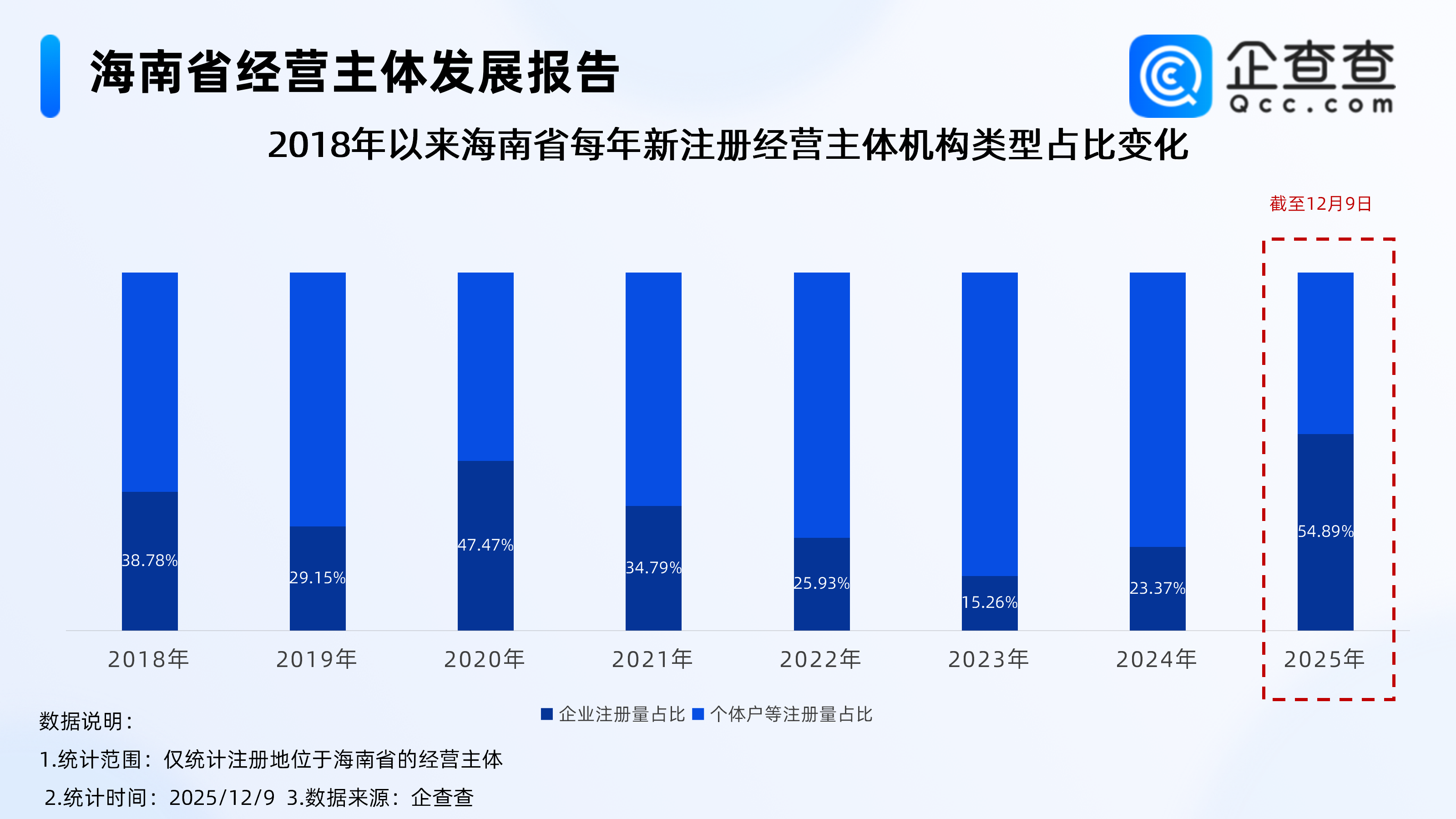 企查查数据显示,截至12月9日,在今年海南省新注册的经营主体中,企业注册量占比超50%,达54.89%。该占比高于2018年以来该省每年企业注册量占比,且系首次企业注册量占比超50%。