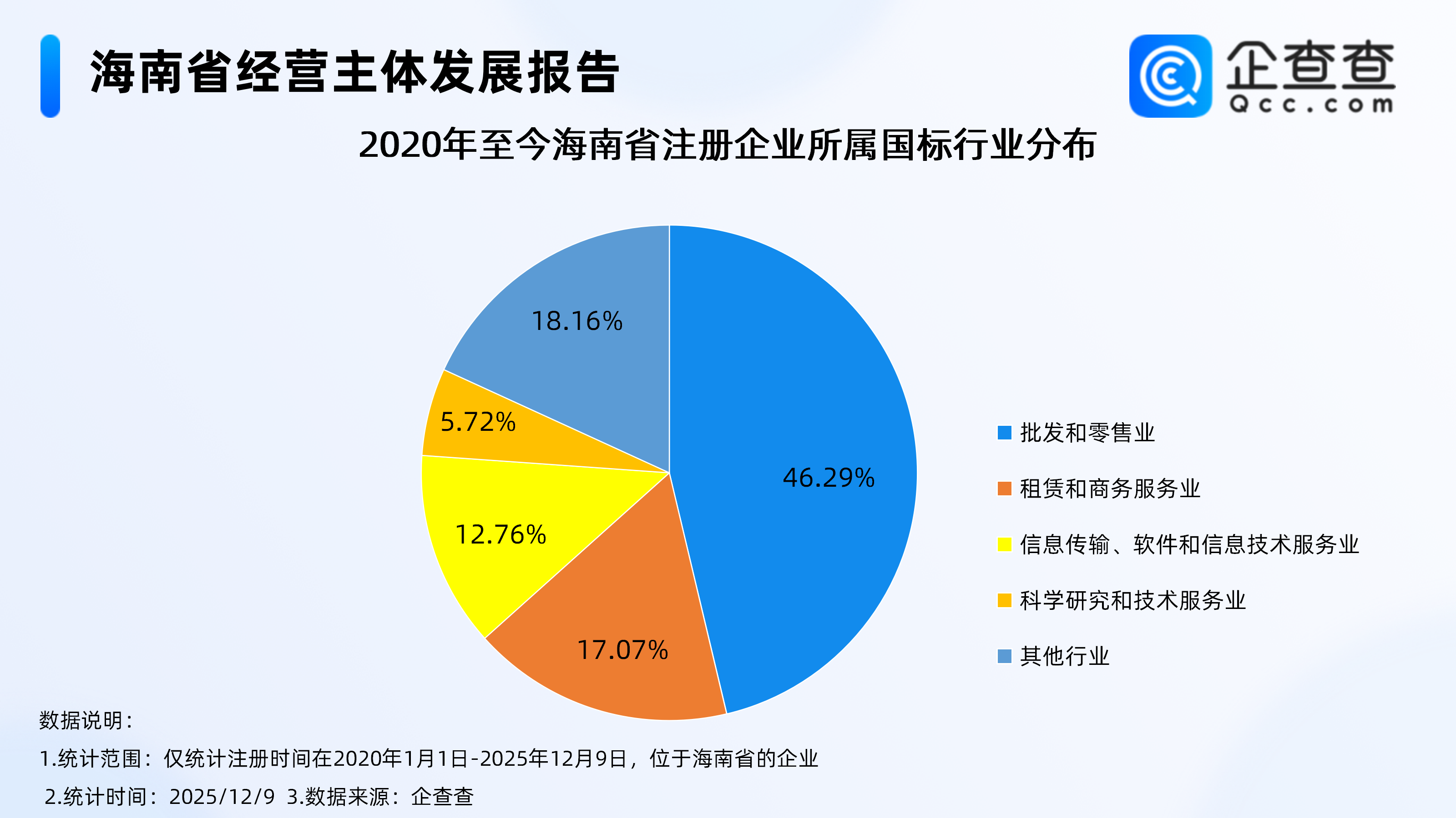 企查查数据显示,通过分析2020年以来海南注册的企业国标行业归属,这121万家企业中,近5成归属于批发和零售业,占比达46.29%,其次为租赁和商务服务业,信息传输、软件和信息技术服务业,分别占比17.07%、12.76%。归属于科学研究和技术服务业的企业,占比达5.72%。