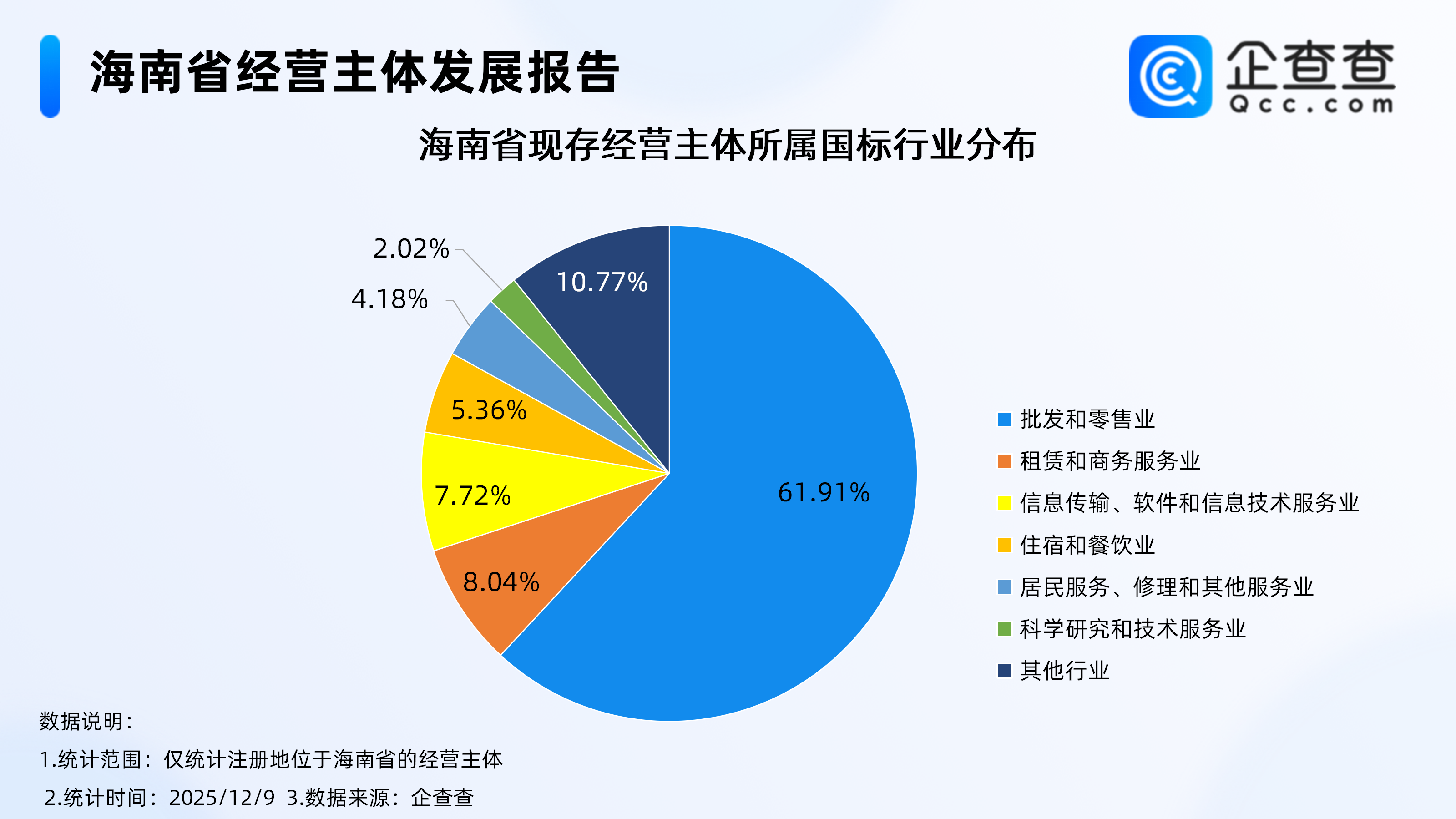 企查查数据显示,从国标行业分布来看,截至目前,海南省现存经营主体中,超6成经营主体归属于批发和零售业,占比达61.91%,其次为租赁和商务服务业,信息传输、软件和信息技术服务业,住宿和餐饮业,分别占比8.04%、7.72%、5.36%,居民服务、修理和其他服务业等其余行业占比均不足5%。