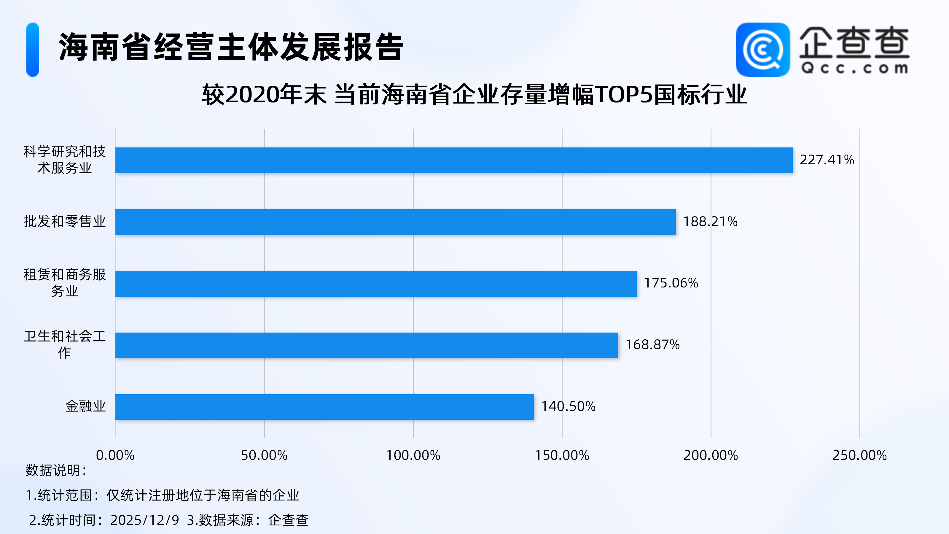 企查查数据显示,较5年前(即2020年末),当前海南企业存量中,增幅最大的为科学研究和技术服务业,增幅达227.41%。除批发和零售业、租赁和商务服务业企业存量增幅较大外,卫生和社会工作、金融业企业存量增幅均超140%。据海南日报报道,近年来,海南全省的创新投入增长显著。数据显示,2024年,全省研究与试验发展经费投入超109亿元,比上年增长22.1%,增速比全国平均水平高出13.2个百分点。“十四五”以来,其年均增速更高达31.5%,快于全国平均水平21个百分点,创新动能澎湃。