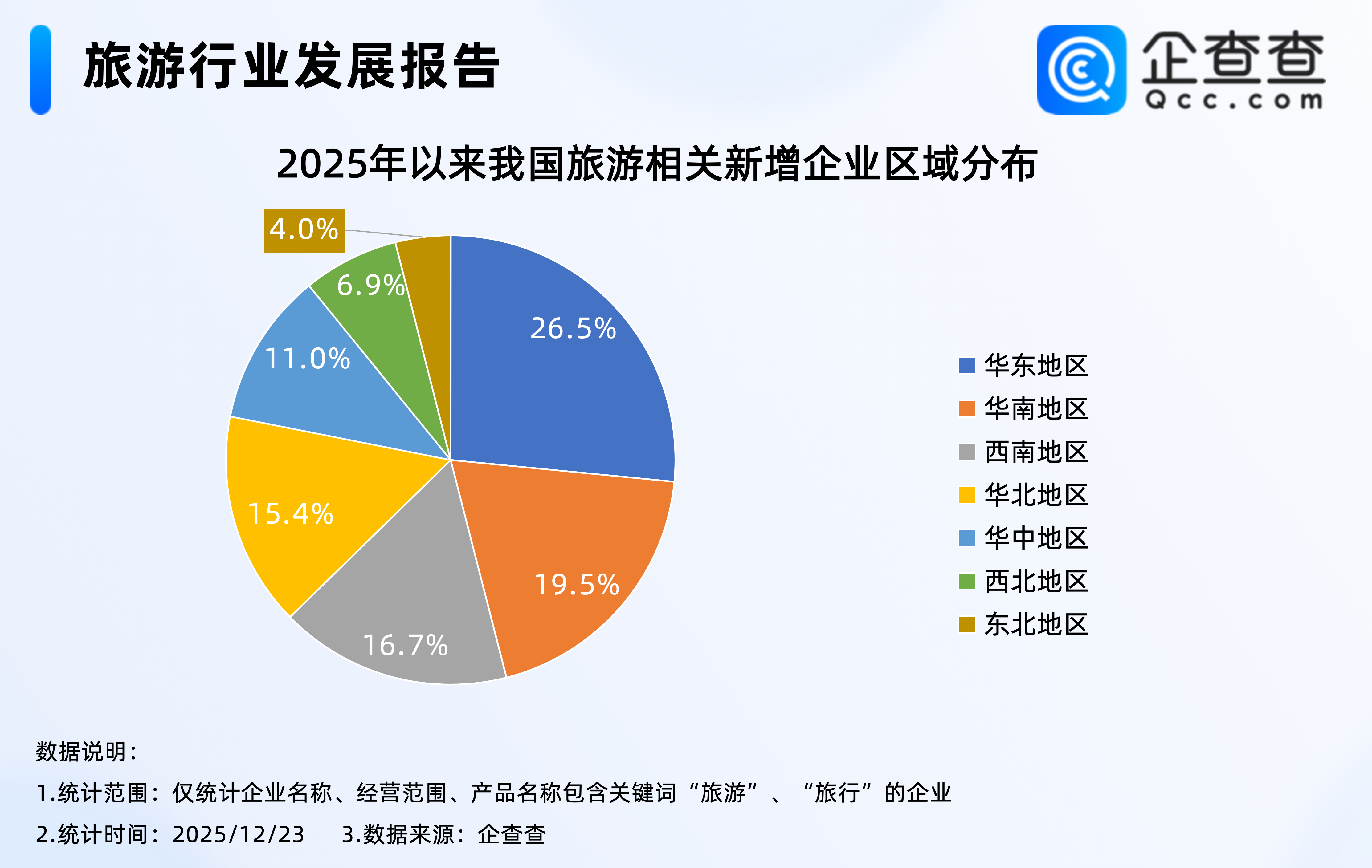 企查查数据显示,2025年以来新注册的31万余家旅游相关企业中,位于华东地区的相关企业最多,占比26.5%,其次是华南地区,占比19.5%,位于西南、华北、华中地区的相关企业占比均在10%-17%之间。