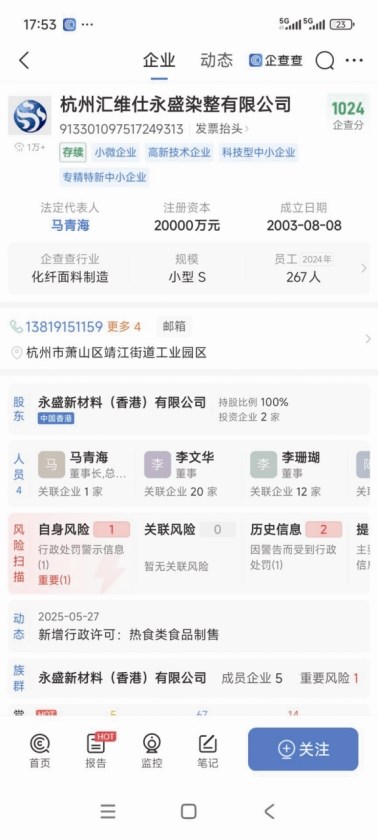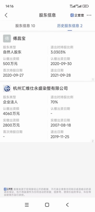 然而,通过企查查查询的工商信息显示,永盛高纤的原控股股东“杭州汇维仕永盛染整有限公司”于2019年11月退出,而该公司行业属性正是“化纤面料制造”,这与福恩股份的面料织造业务疑似存在重叠。