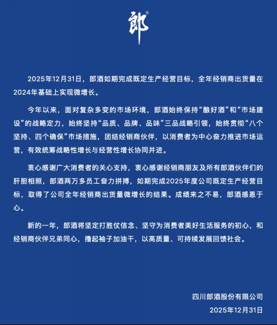 12月31日,郎酒股份公众号发文称,2025年如期完成既定生产经营目标,全年经销商出货量在2024年基础上实现微增长。