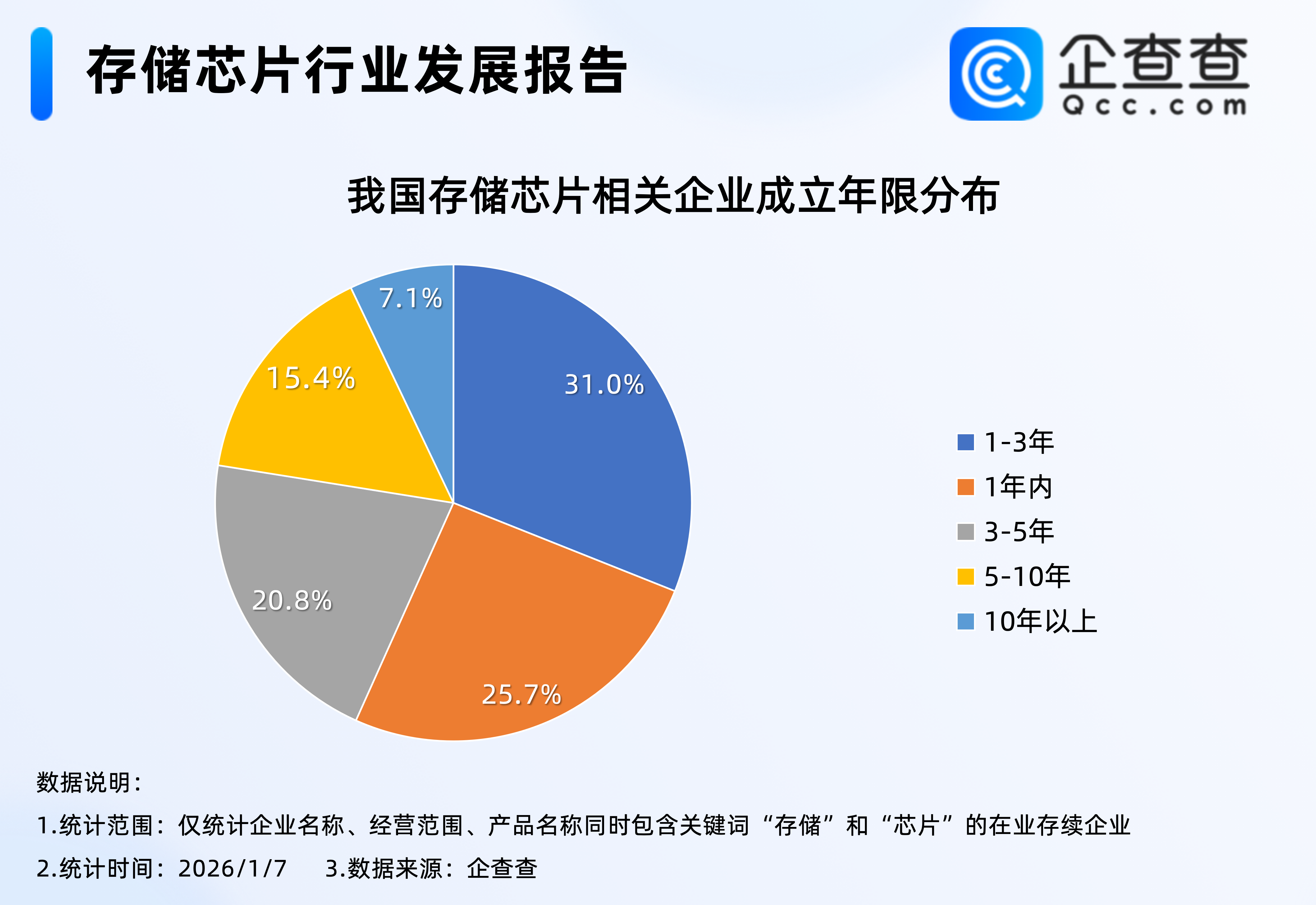 企查查数据显示,截至1月7日,我国现存4.6万家存储芯片相关企业,其中成立于1至3年之间的企业占比31.0%,成立于1年内的企业占比25.7%,综合来看,成立于近三年的企业合计占比56.7%。