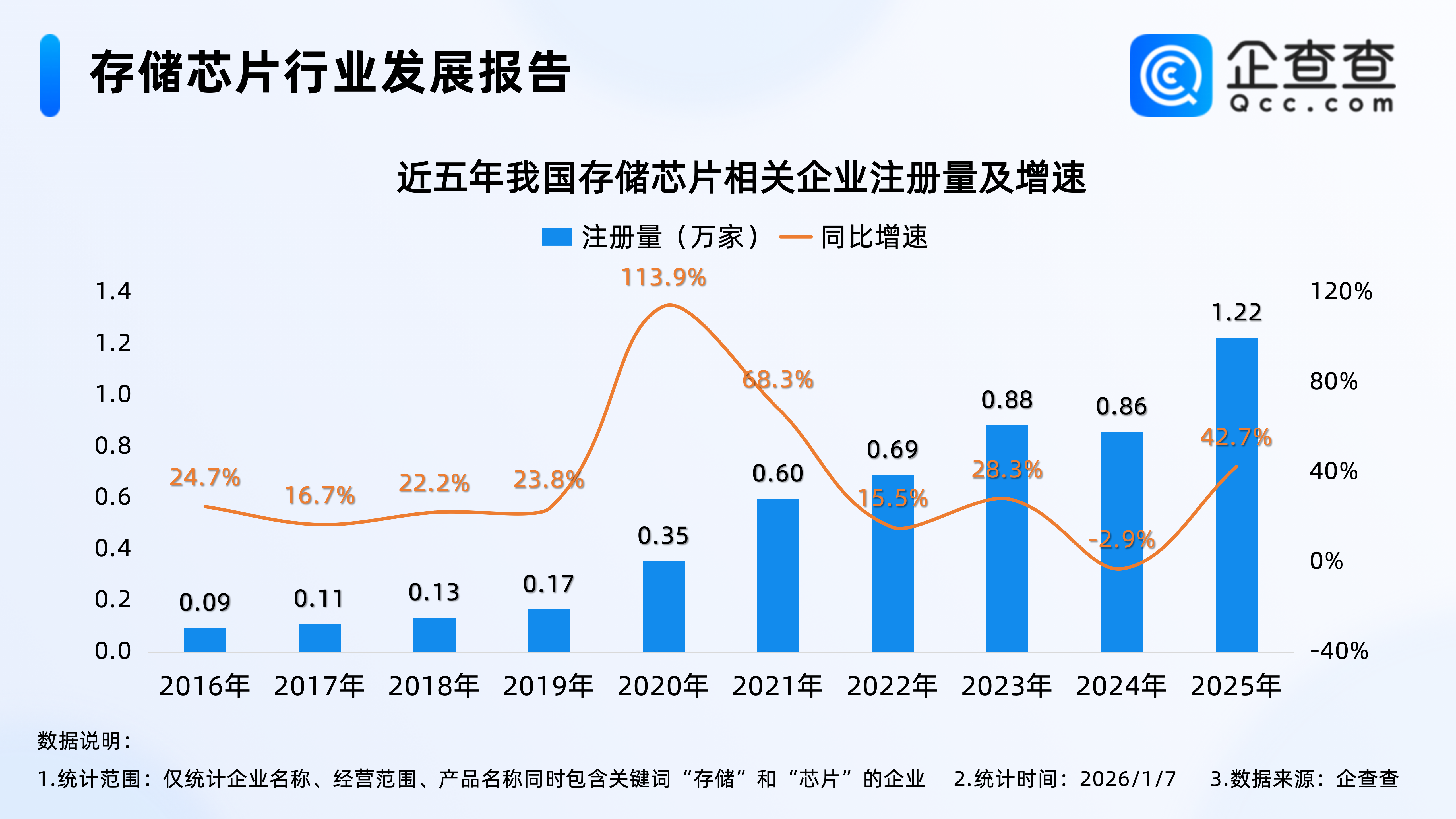 企查查数据显示,2016年以来,我国存储芯片相关企业基本逐年增加,其中2020年相关企业注册量同比大幅增加113.9%至0.35万家,达近十年相关企业注册量增速峰值,2025年全年,我国累计注册1.22万家存储芯片相关企业,同比增加42.7%,达近十年相关企业注册量峰值。