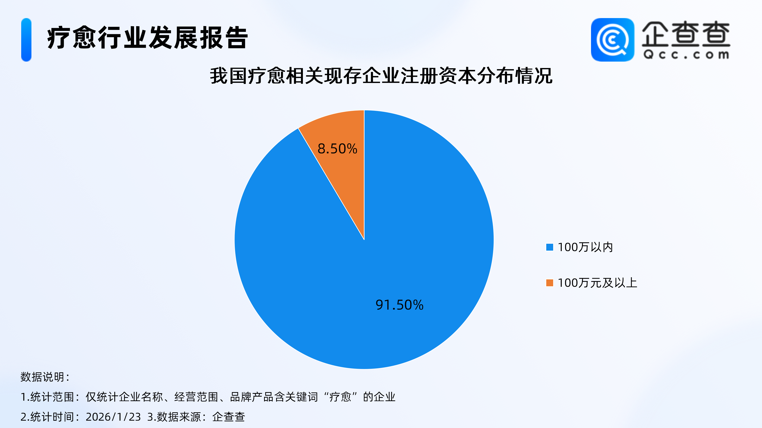 企查查数据显示,注册资本方面,国内疗愈相关现存企业中,超9成相关企业注册资本在100万元以内,占比达91.5%。注册资本在100万元及以上的相关企业,占比不足10%,达8.5%。