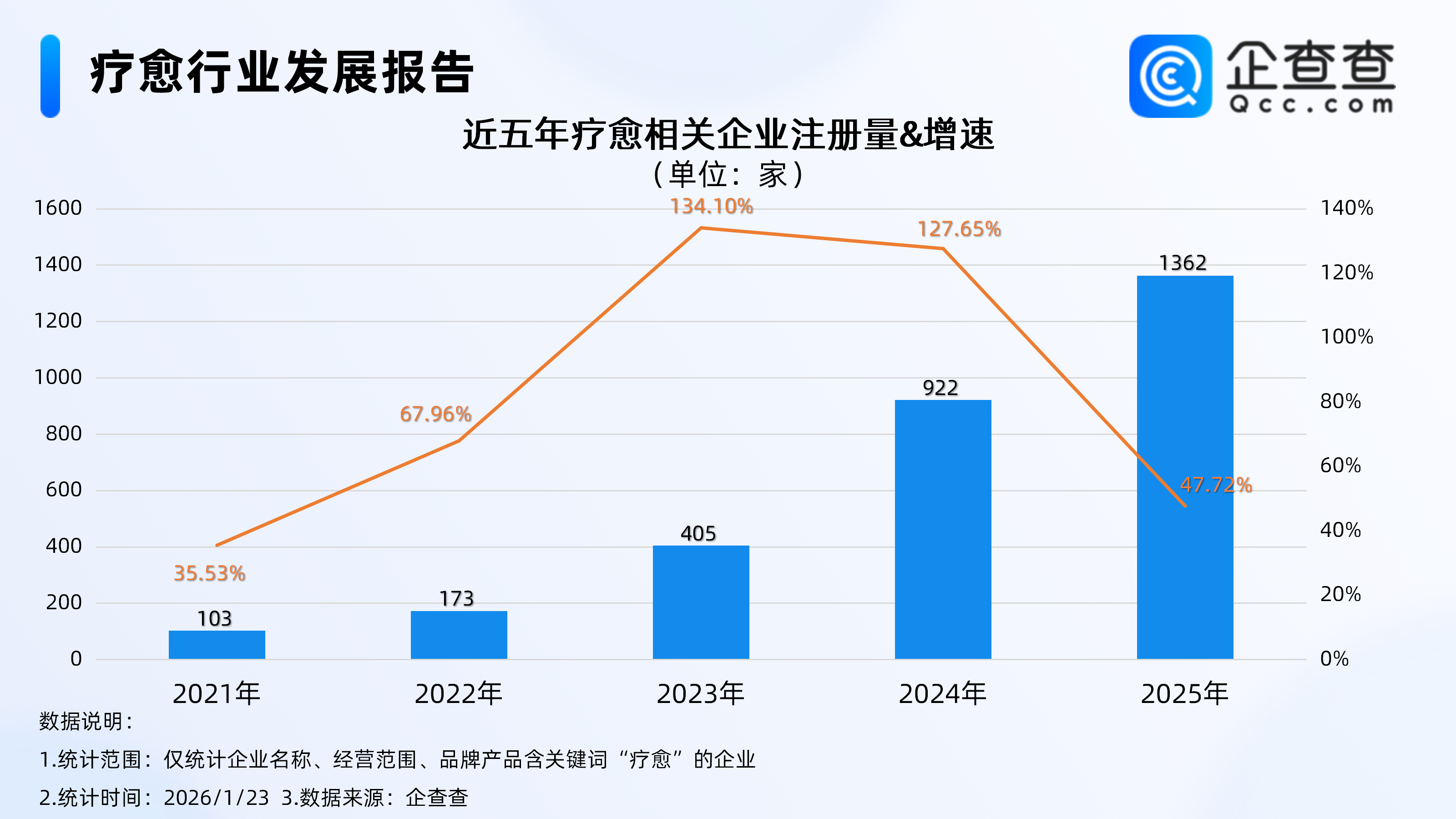 企查查数据显示,注册量方面,近5年疗愈相关企业注册量呈逐年上涨趋势,2023年、2024年连续两年注册量增速超100%,2025年注册量首次突破千家,达1362家,同比增长47.72%。