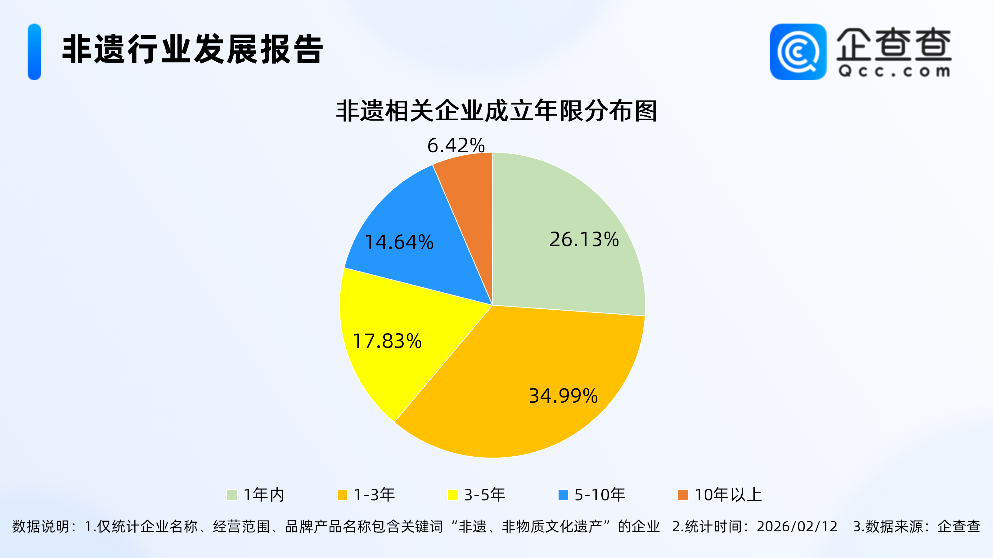 企查查数据显示,截至2月12日,国内现存非遗相关企业18.54万家。近十年非遗相关企业注册量呈持续增长态势,2025年全年注册4.8万家非遗相关企业,同比增长21.10%,创近十年注册量新高。截至目前,今年已注册非遗相关企业0.51万家。存量方面,从经营时间来看,非遗相关企业多成立于近三年,成立年限在1-3年的相关企业最多,占比34.99%。从地区分布来看,非遗相关企业多分布在华东地区,占比达29.55%。