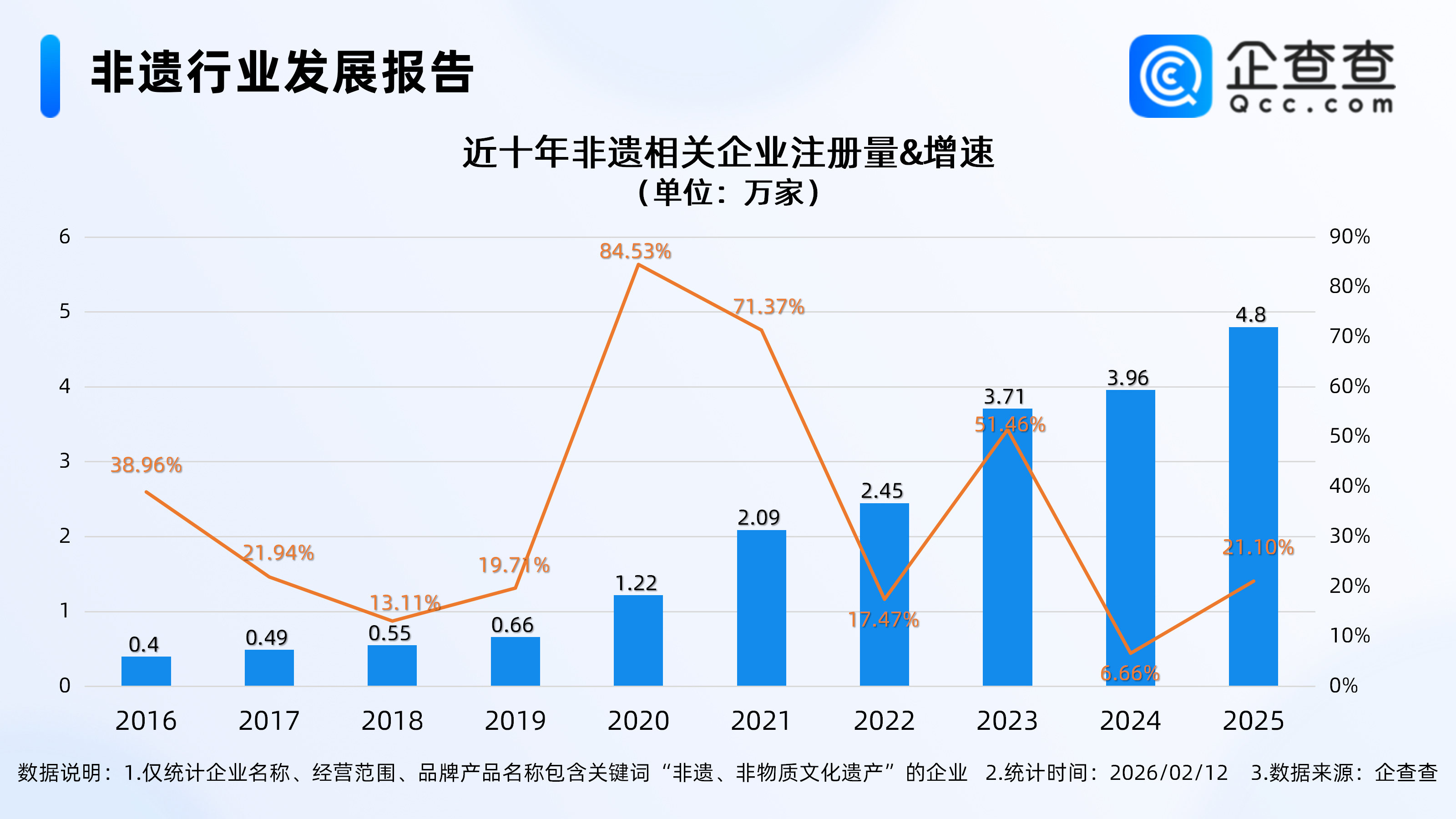 企查查数据显示,截至2月12日,国内现存非遗相关企业18.54万家。近十年非遗相关企业注册量呈持续增长态势,其中2020年全年注册1.22万家相关企业,同比增长84.53%,达近十年注册量增速峰值。2025年全年注册4.8万家非遗相关企业,同比增长21.10%,创近十年注册量新高。截至目前,今年已注册非遗相关企业0.51万家。