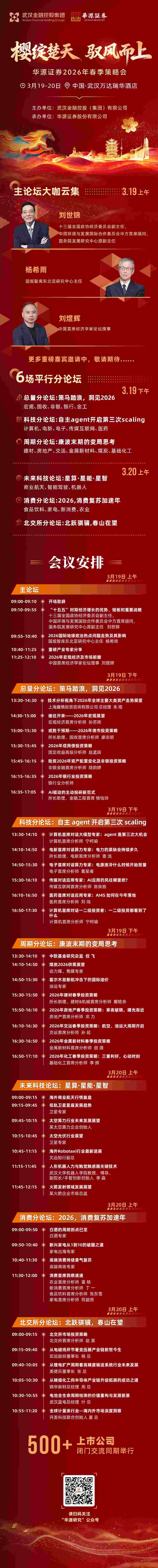 春回荆楚,樱满江城;3月22日,2026武汉马拉松将鸣枪起跑。作为赛事官方赞助商和供应商,武汉金控集团与华源证券始终扎根江城、与城市同频共振,让“奔跑力量”与“金融赋能”深度融合,将金融国企的责任与担当融入城市发展脉络,于3月19日至20日在武汉联合主办“樱绽楚天 驭风而上”——华源证券2026年春季策略会。活动汇聚政、产、学、研各界精英,邀请众多行业领袖、知名专家学者、上市公司高管及资深投资人齐聚一堂,预计线上线下参会上市公司将超过500家,搭建产业链接桥梁,共同把脉宏观经济走势,探寻产业变革机遇,彰显智库担当。