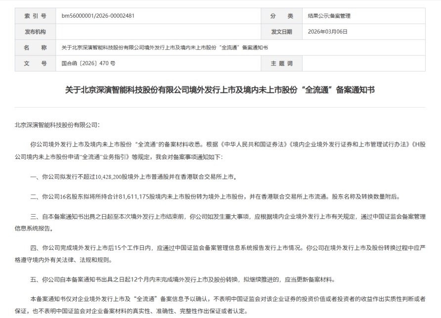 近日,中国证监会发布了关于北京深演智能科技股份有限公司(下称“深演智能”)的境外发行上市备案通知书,标志着其赴港上市进程取得关键进展。根据备案通知书,公司拟发行不超过10,428,200股境外上市普通股并在香港联合交易所上市。