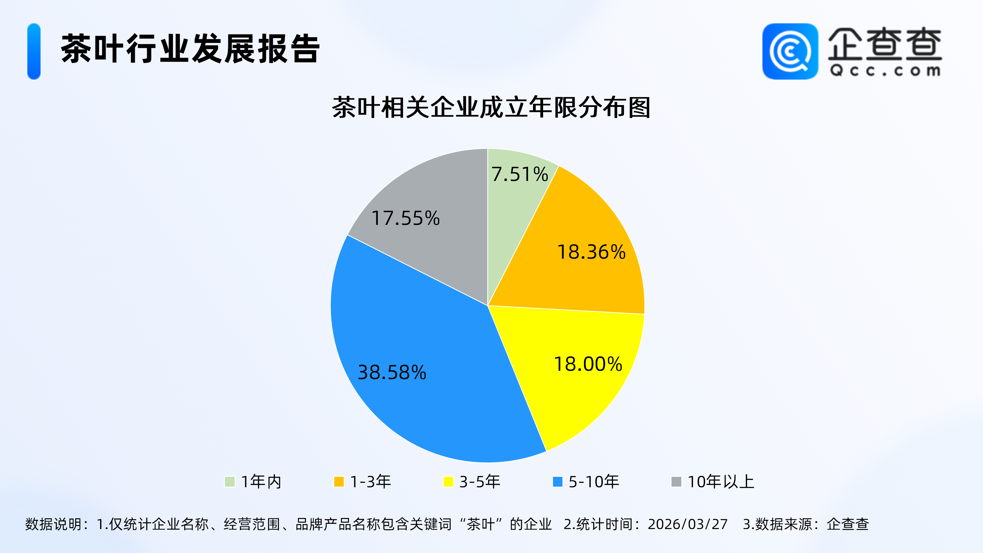企查查数据显示,截至3月27日,国内现存茶叶相关企业165.17万家。近十年我国茶叶相关企业年末存量呈稳步增长态势,2025年末存量达164.14万家,较2016年增长约181.2%,反映出茶产业市场活力持续释放。从企业成立年限分布看,成立5-10年的企业占比最高,达38.58%。茶叶相关企业区域分布呈现明显集聚特征,华东地区占比最高,达36.96%。注册量方面,2025年全年注册13.9万家,截至目前,今年已注册2.58万家。