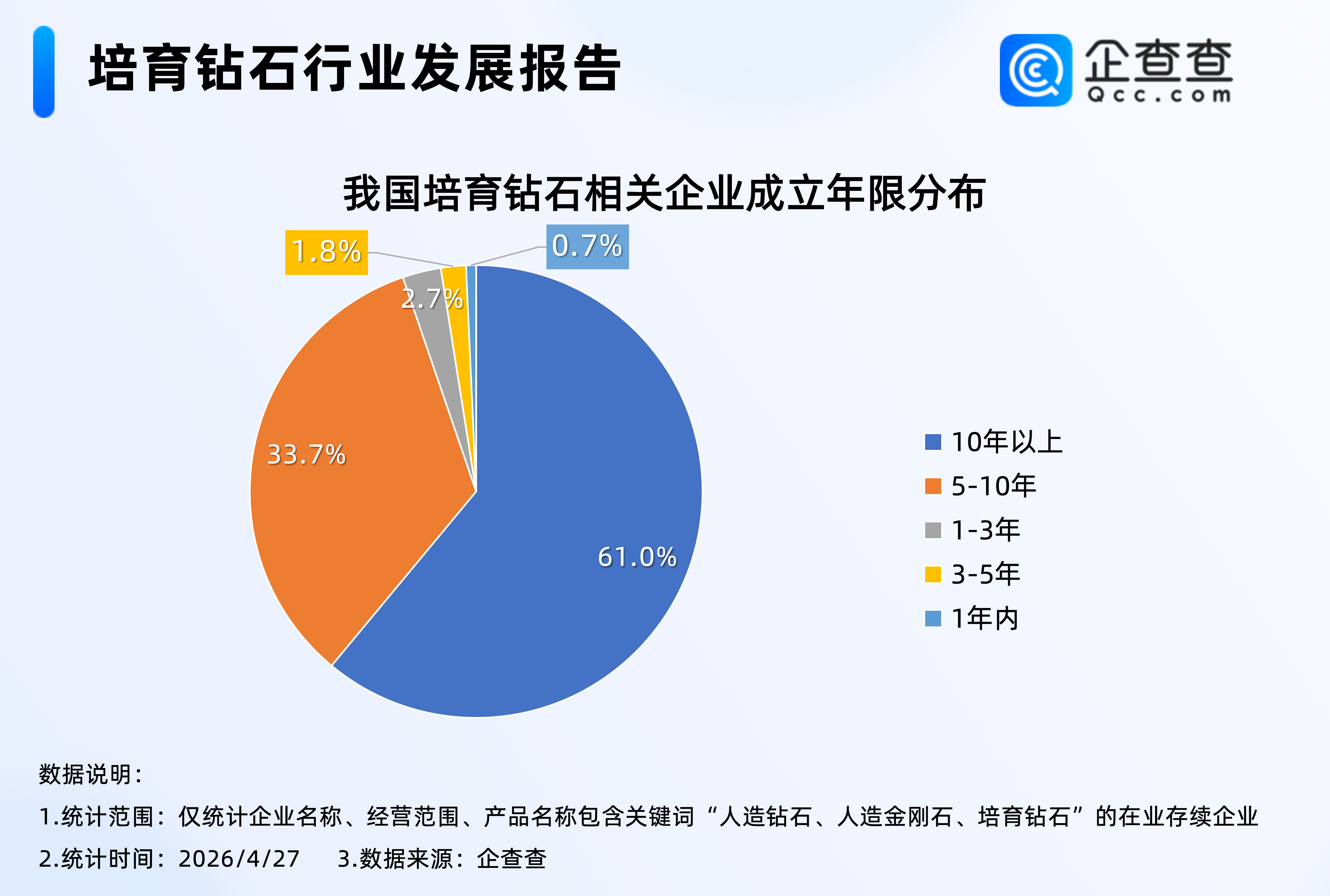 企查查数据显示,成立年限上,我国培育钻石领域多为老牌企业,成立10年以上的企业占比高达61.0%,其次是成立5至10年之间的企业,占比33.7%,综合来看,成立超5年的企业合计占比接近95%。