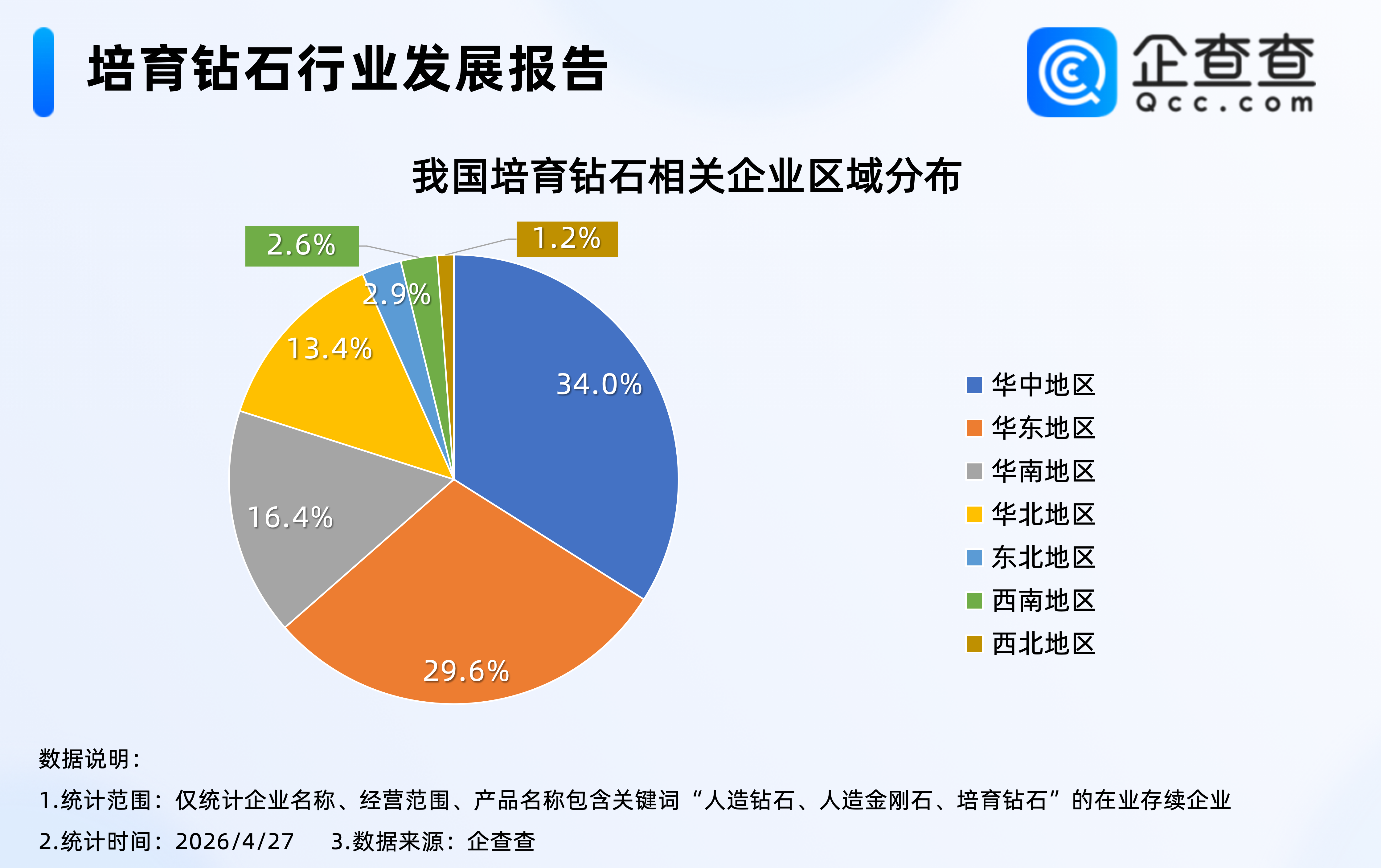 企查查数据显示,截至4月27日,我国现存842家培育钻石相关企业,区域分布上,分布在华中地区的相关企业最多,占比34.0%,其次是华东地区,占比29.6%,西南、西北地区培育钻石相关企业存量相对较少,分别占比2.6%、1.2%。