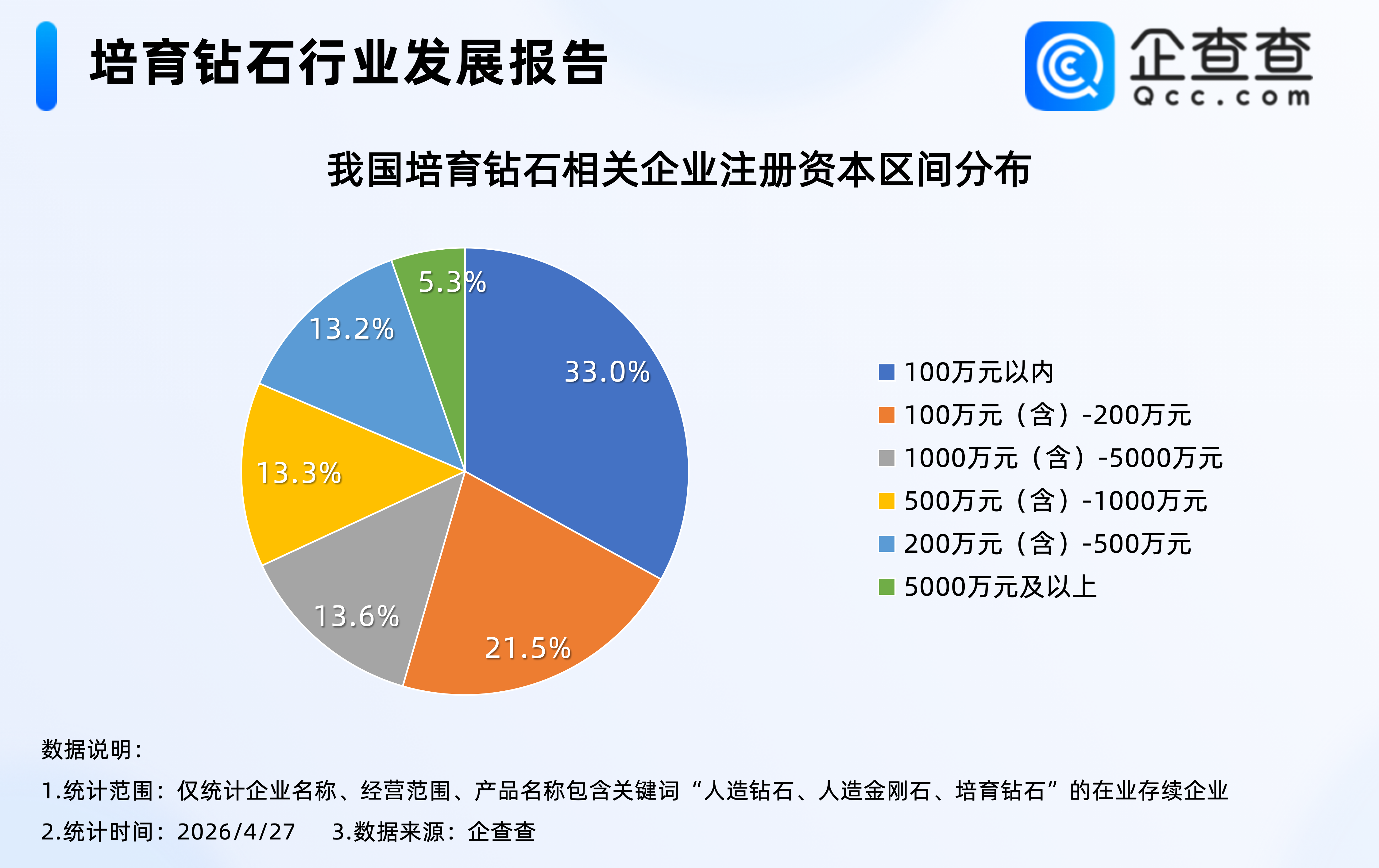 企查查数据显示,注册资本区间分布上,培育钻石领域注册资本集中在200万元以内,合计占比54.5%,其中注册资本在100万元以内的企业占比33.0%;另外,注册资本在500万元(含)至5000万元之间的企业合计占比26.9%。