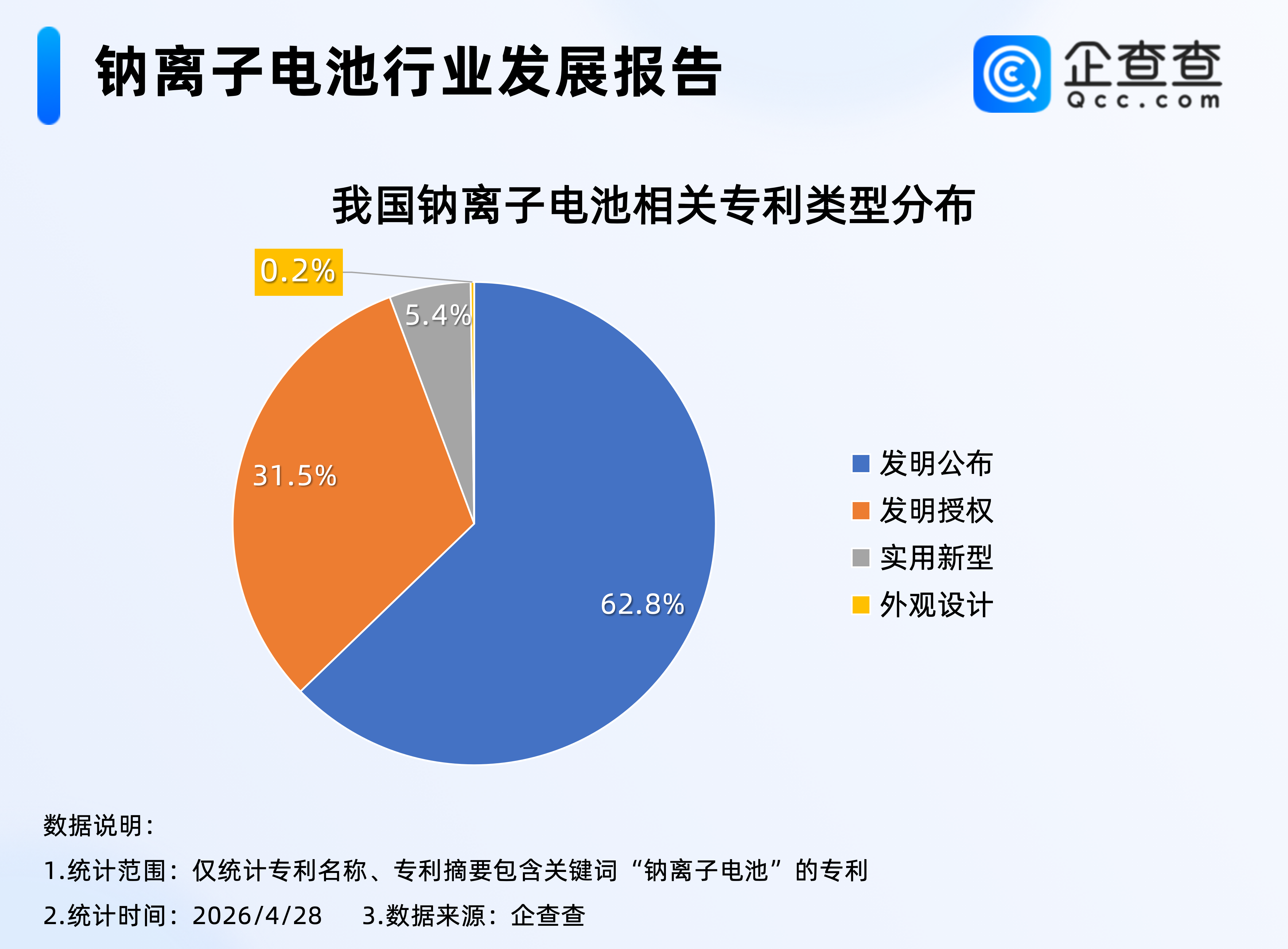 企查查数据显示,截至2026年4月28日,我国现有1.2万项钠离子电池相关专利。类型上以发明公布为主,占比超六成,达62.8%,其次是发明授权,占比31.5%。