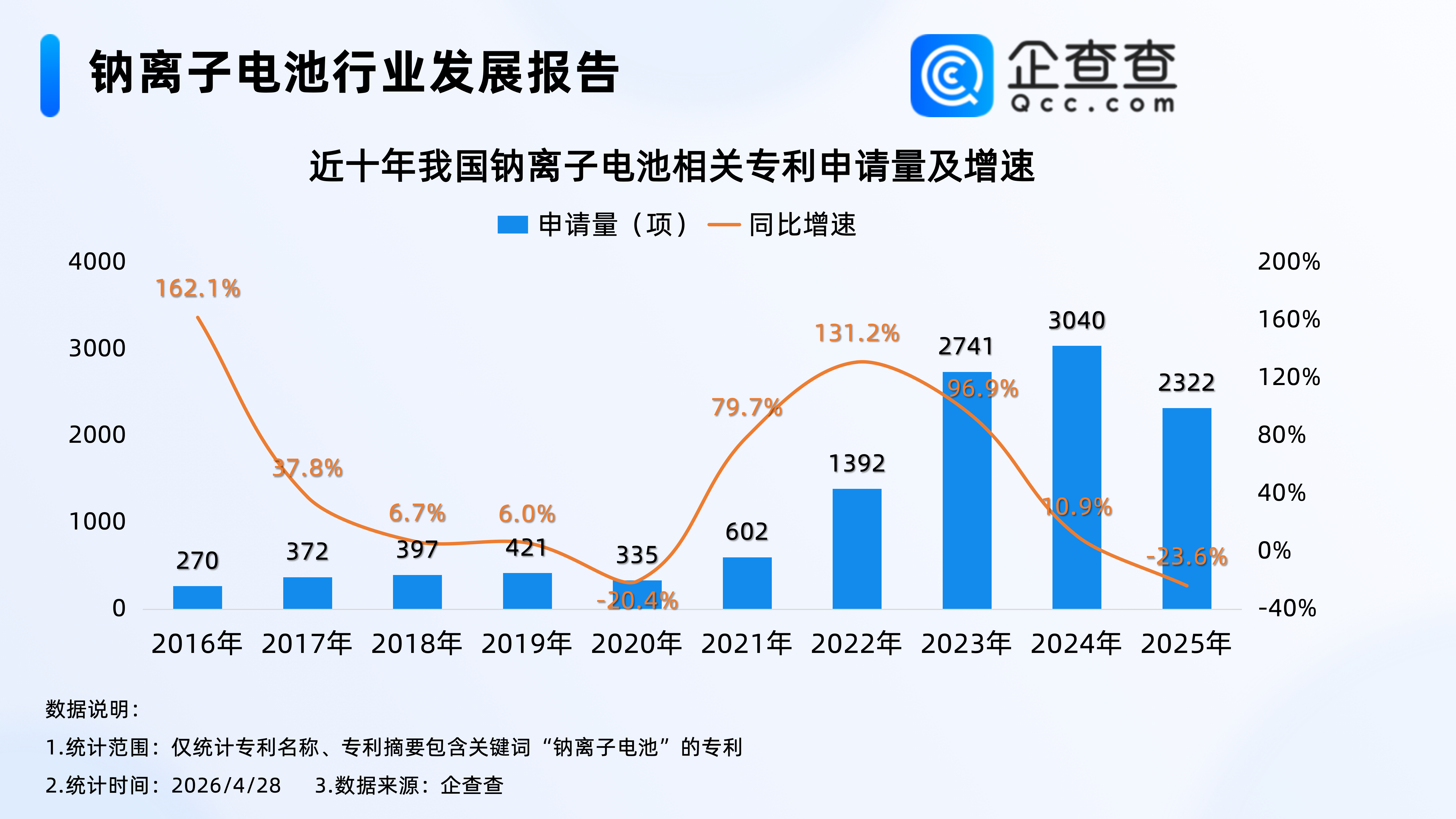 企查查数据显示,2016年至2020年,我国钠离子电池相关专利每年申请量在300项至500项之间,并从2021年开始逐年增加至2024年的3040项,达近十年专利申请量高峰,其中2022年专利申请量同比大幅增加131.2%至1392项,达近十年申请量增速峰值。2025年全年,我国累计申请2322项钠离子电池相关专利。
