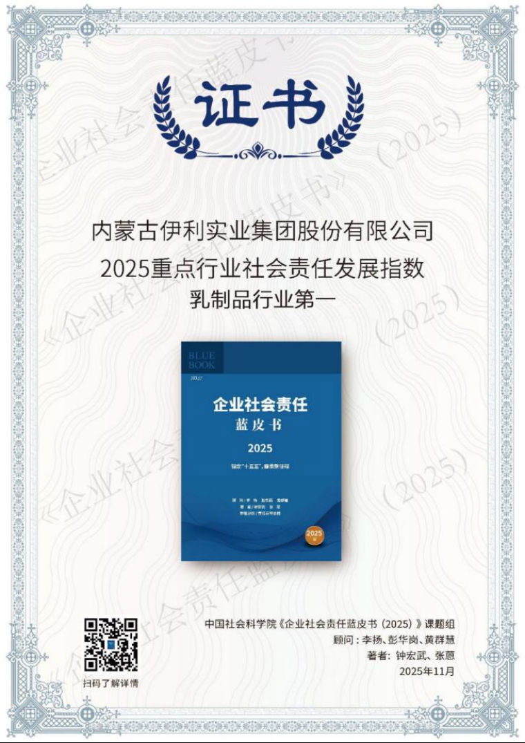 《企业社会责任蓝皮书(2025)》由中国社会科学院权威编制,已连续发布17载,其创新构建的“中国企业社会责任发展指数”,已成为评价大企业社会责任管理与信息披露水平的权威标尺,成为企业社会责任领域具有权威性和影响力的评价成果。作为行业龙头企业,伊利第8次荣获乳制品行业社会责任发展指数第一,是权威学术机构中国社科院对伊利主动践行ESG理念的再次肯定,更是伊利将可持续发展转化为核心竞争力的有力佐证。伊利以核心能力驱动社会价值创新,推动商业价值与社会价值“两价融合”,践行“共创价值、共享美好”的愿景,实现社会价值的“共创、共益、共享”。