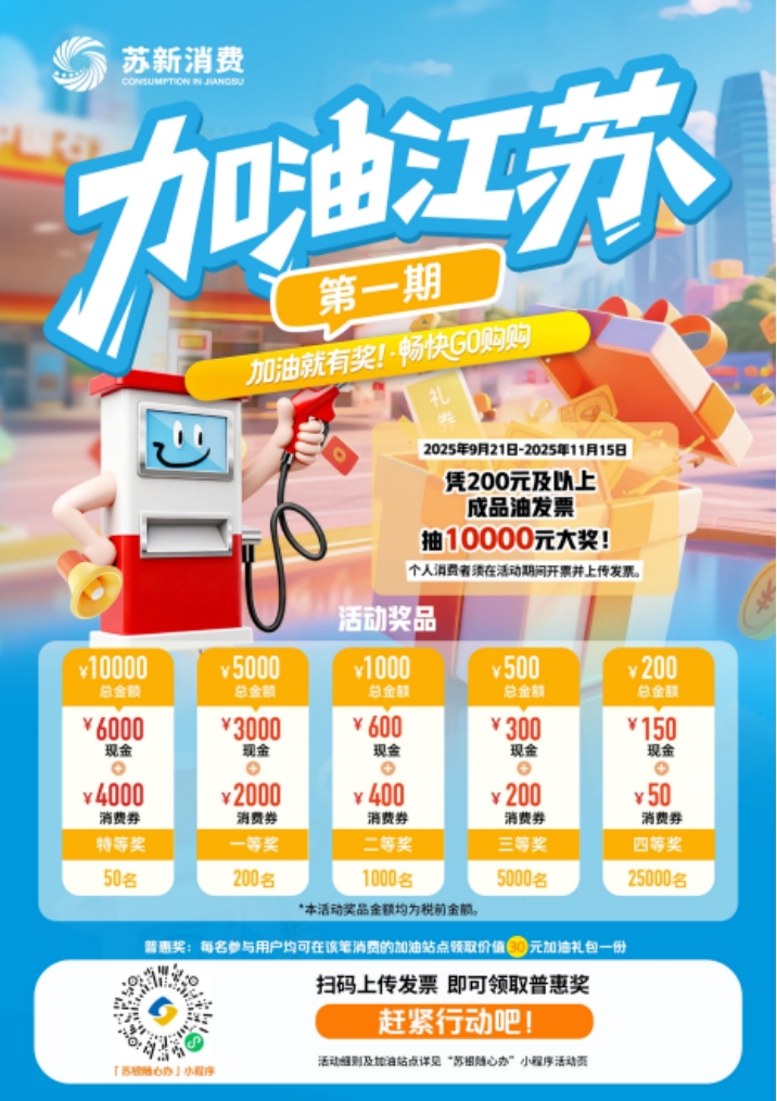 由江苏省商务厅、省财政厅、省税务局主办的“加油江苏”有奖发票活动于9月21日正式开启,并在江苏银行微信小程序“苏银随心办”上线。消费者在江苏加油超200元并开具个人发票,即可参与抽奖,奖金最高1万元!