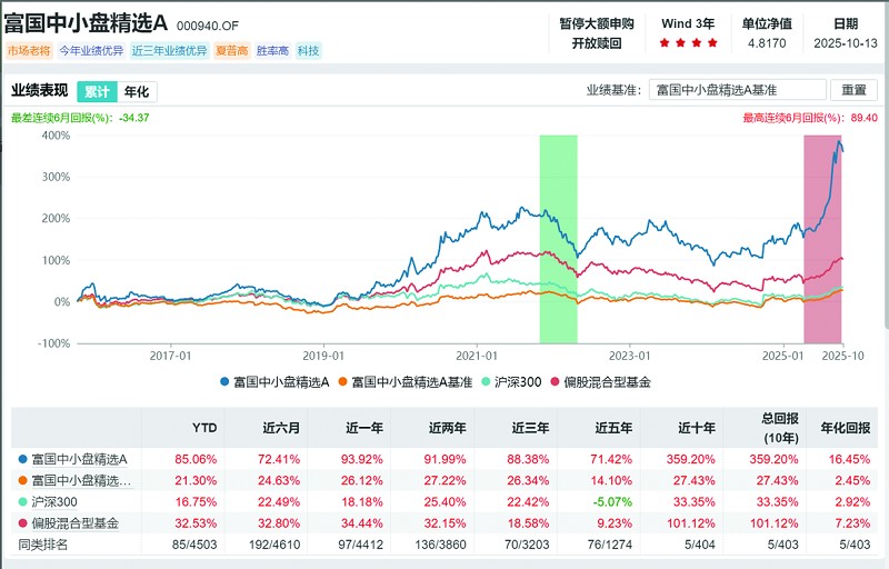 短期业绩来看,富国中小盘精选A今年以来回报率超过85%,相比于同期的业绩比较基准、沪深300指数、偏股混合型基金指数均取得了大幅超额收益。