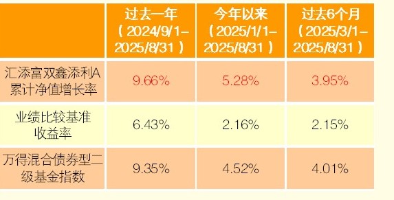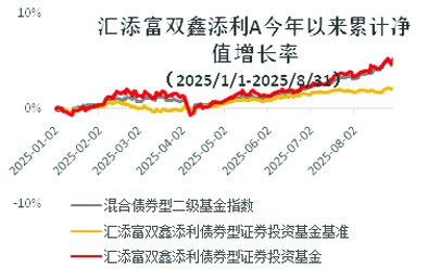 汇添富双鑫添利由汇添富年年丰定期开放转型而来,属于稳健型二级债基(股票仓位0-20%,港股占权益仓位比例不超过50%),主要投资于债券类固收品种,同时在控制风险的前提下精选沪港深三地优秀个股。今年以来基金业绩亮眼,累计回报5.28%,超越同期业绩比较基准(2.16%)和万得混合二级债基指数收益(4.78%)(截至2025年8月31日)。